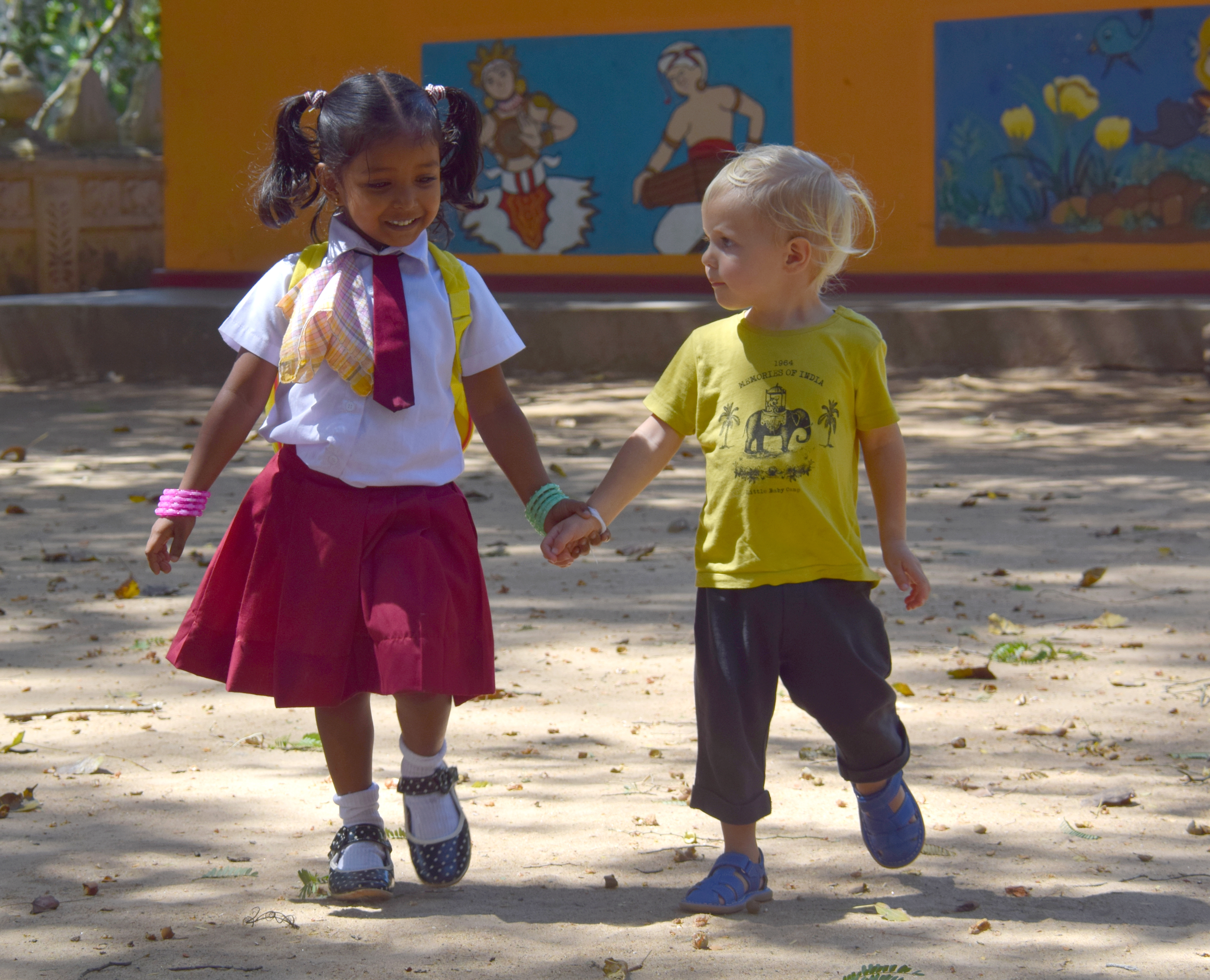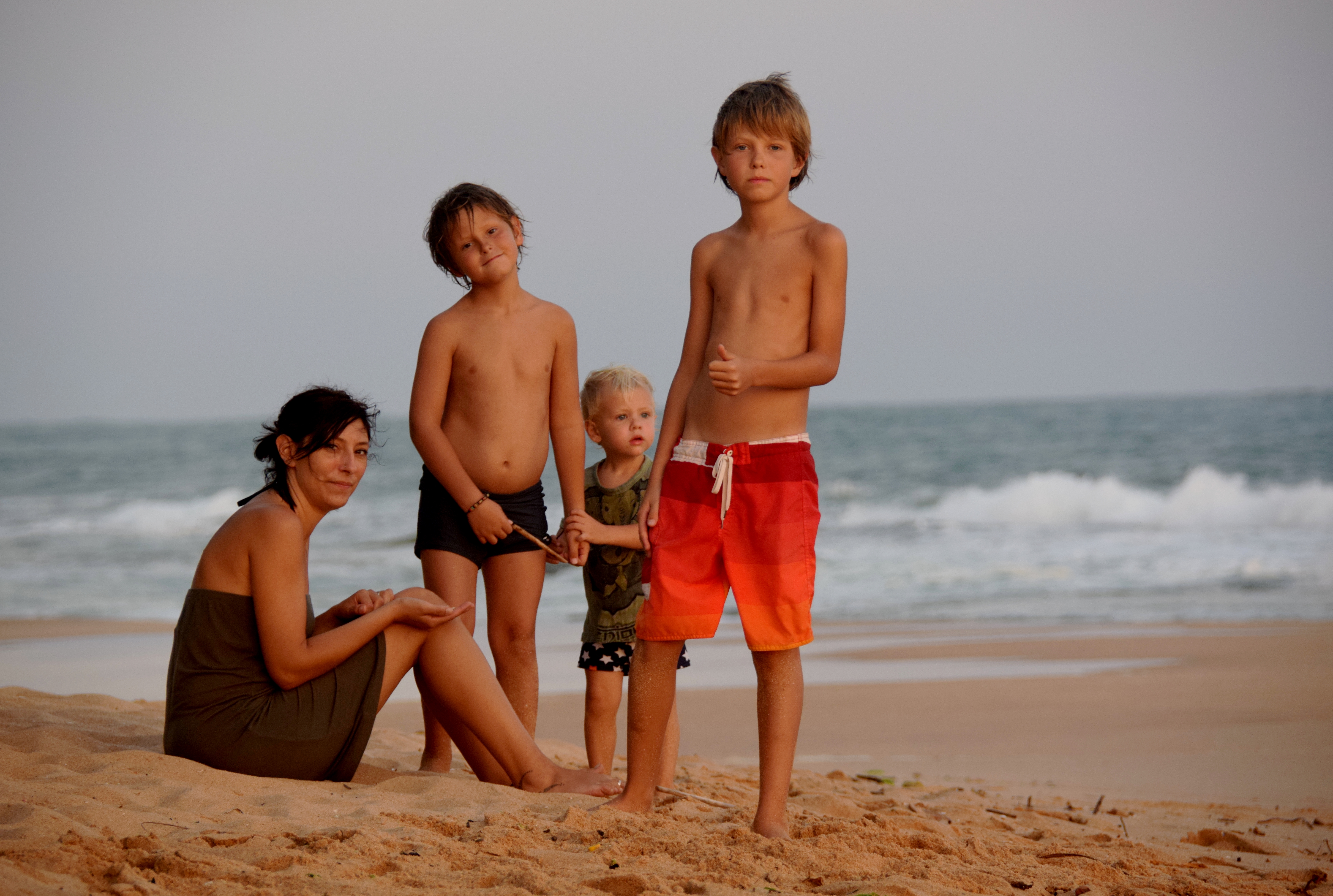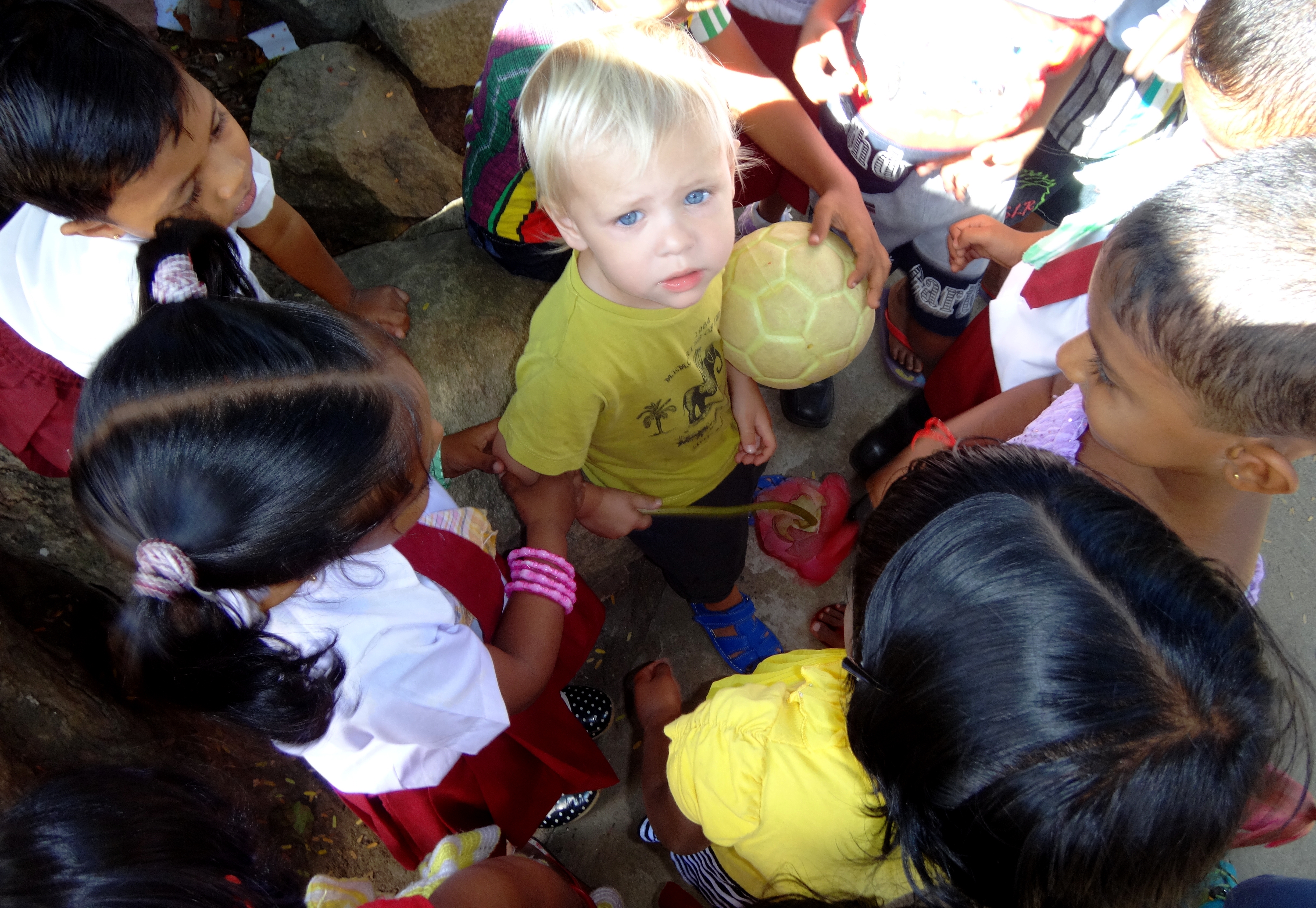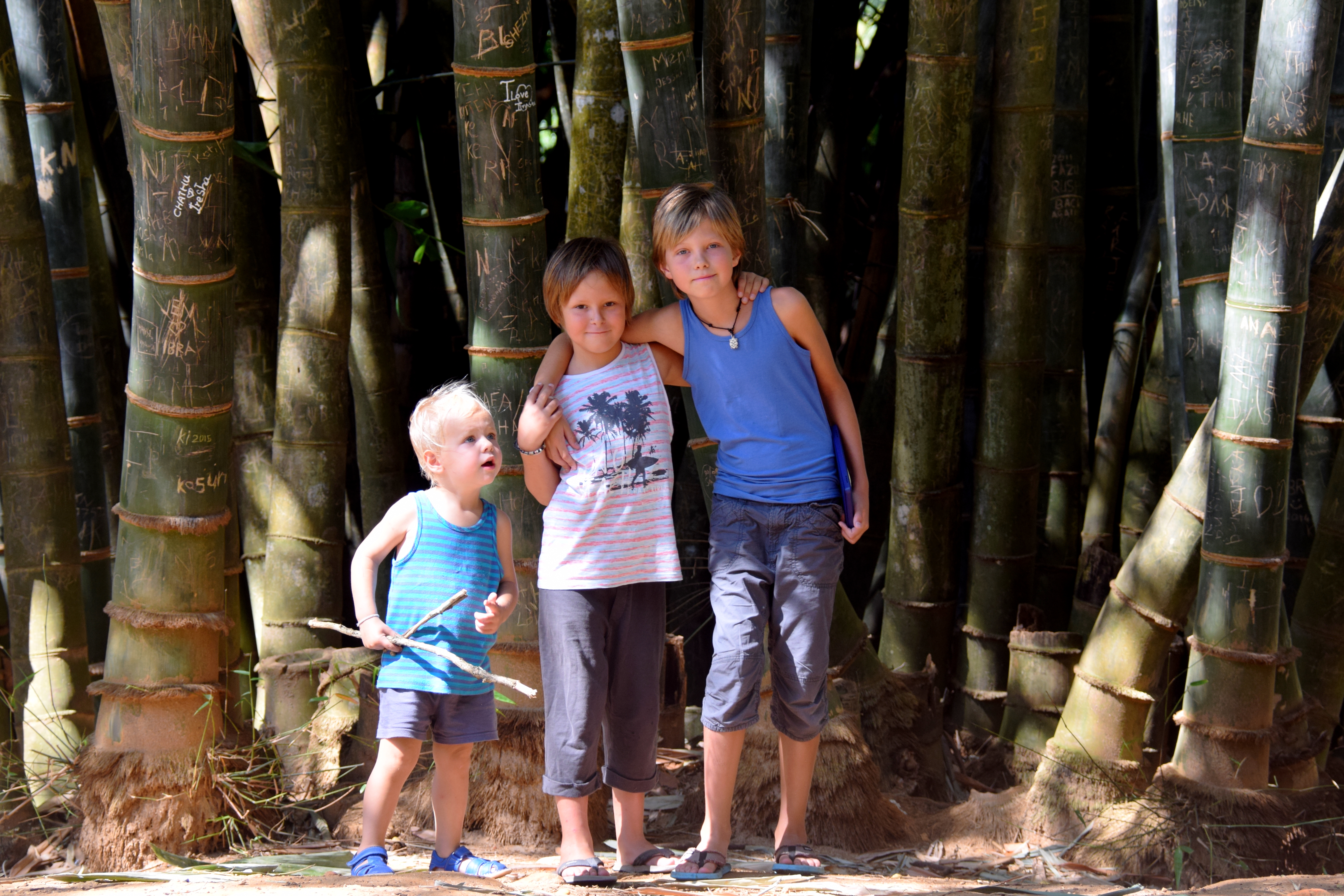 A l’entrée il y a une petite école maternelle avec une classe unique, sitôt arrivés Maleï est déjà le centre d’attention, tous les enfants lui font des papouilles, lui touchent les mains, les cheveux…sous les regards jaloux de Tao et Teva ! Et nous de leur rappeler qu’au même âge Tao était une star sur le marché de Cayenne, qu’il se faisait offrir un jus tous les mercredis matins ! Et que Teva se faisait tellement toucher les cheveux ou les joues en Thaïlande qu’il n’en pouvait plus ! Que les tahitiens leur offraient tout le temps des crèpes ou des fruits tellement qu’ils étaient mimis ! A chaque âge ses joies…et ses inconvénients !