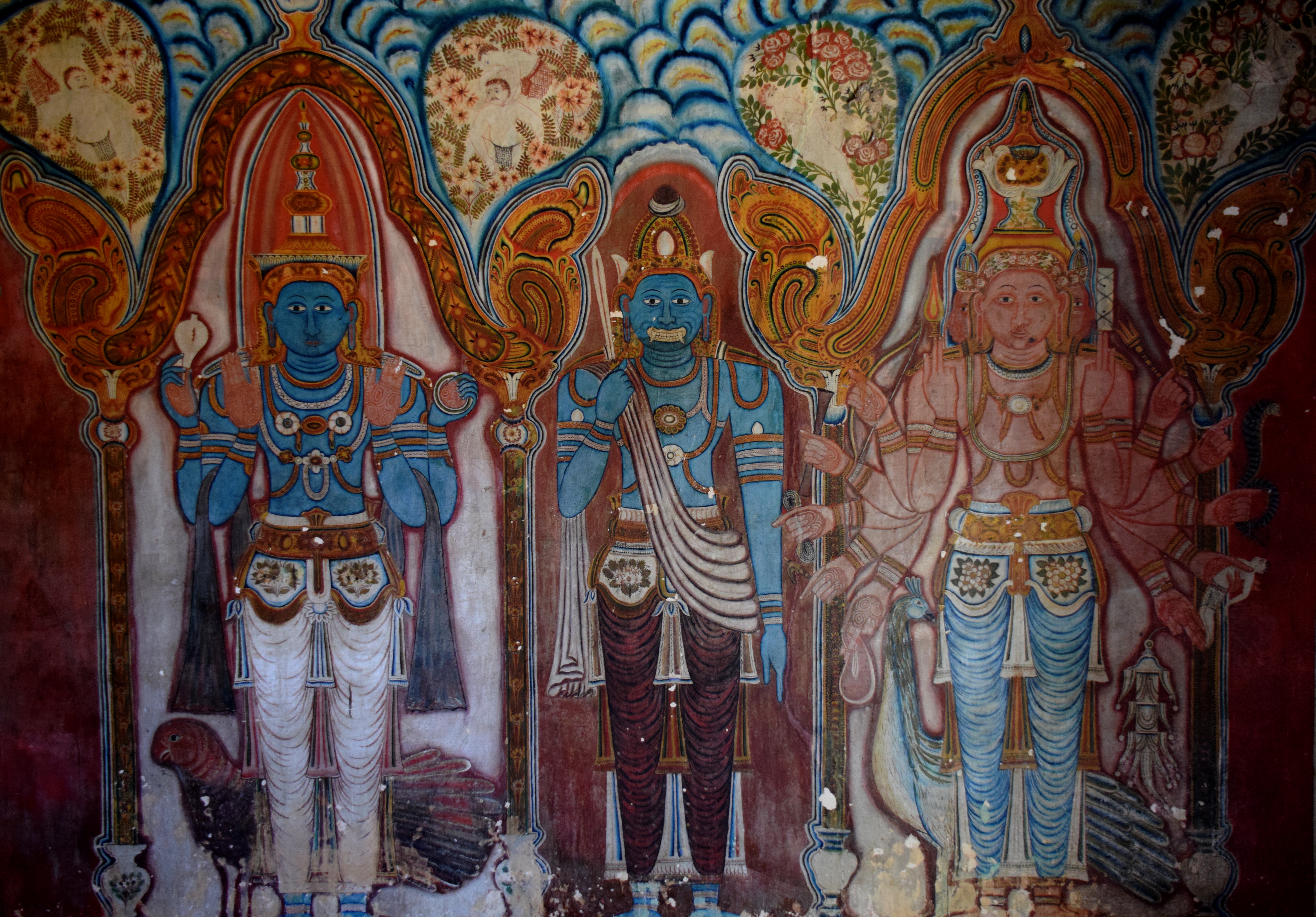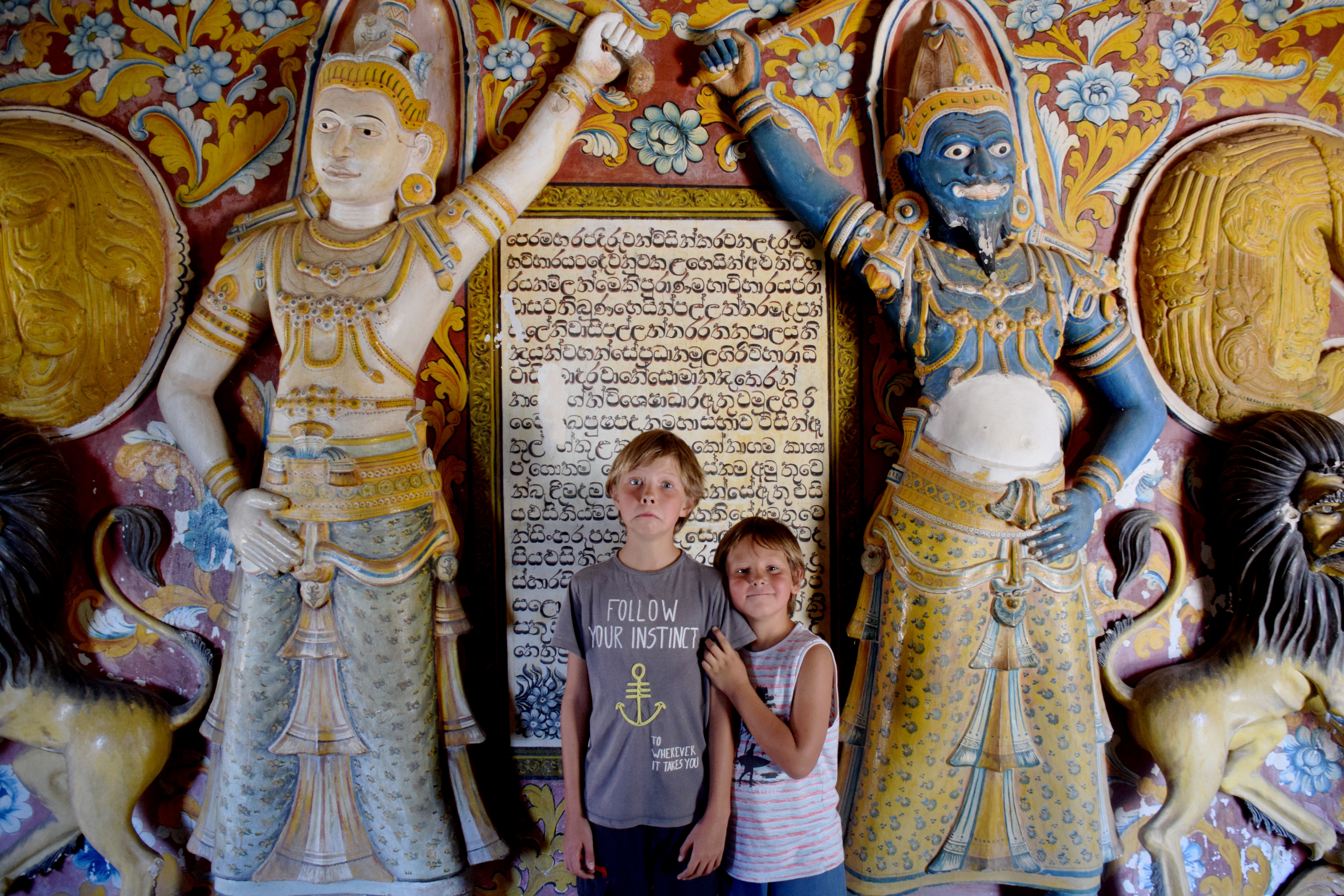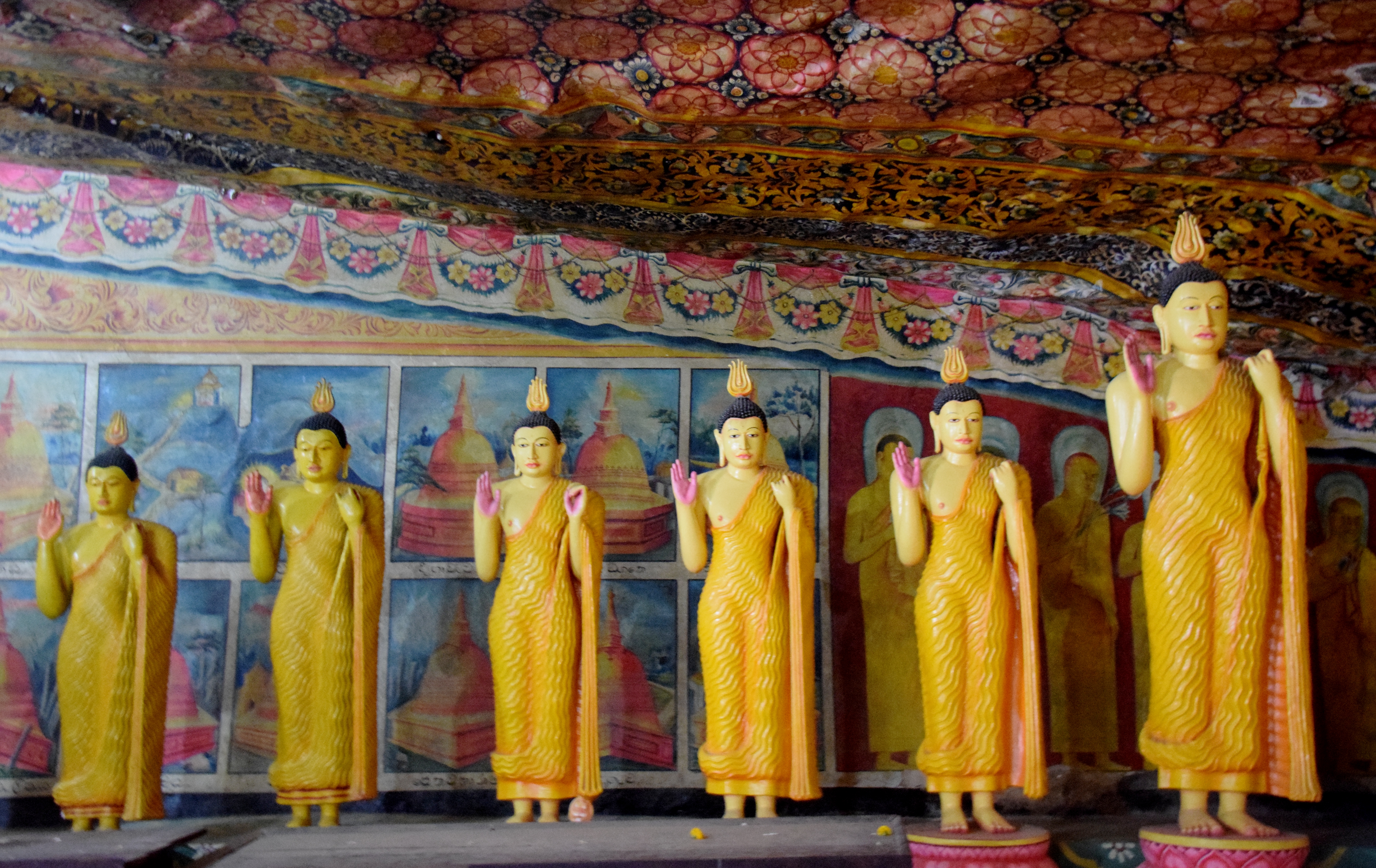 Avant-hier nous avons été visiter les temples rupestres de Mulkirigala. Ils existent depuis plus de 2000 ans, ceux que l’on voit aujourd’hui et leurs peintures datent du XVIIIème siècle. Il y a Bouddha sous toutes les coutures, assis, debout, couché, rieur…et des scènes de la vie quotidienne. Ce sont ces fresques et ces sculptures qui ont permis aux européens de connaître l’histoire ancienne du Sri Lanka…