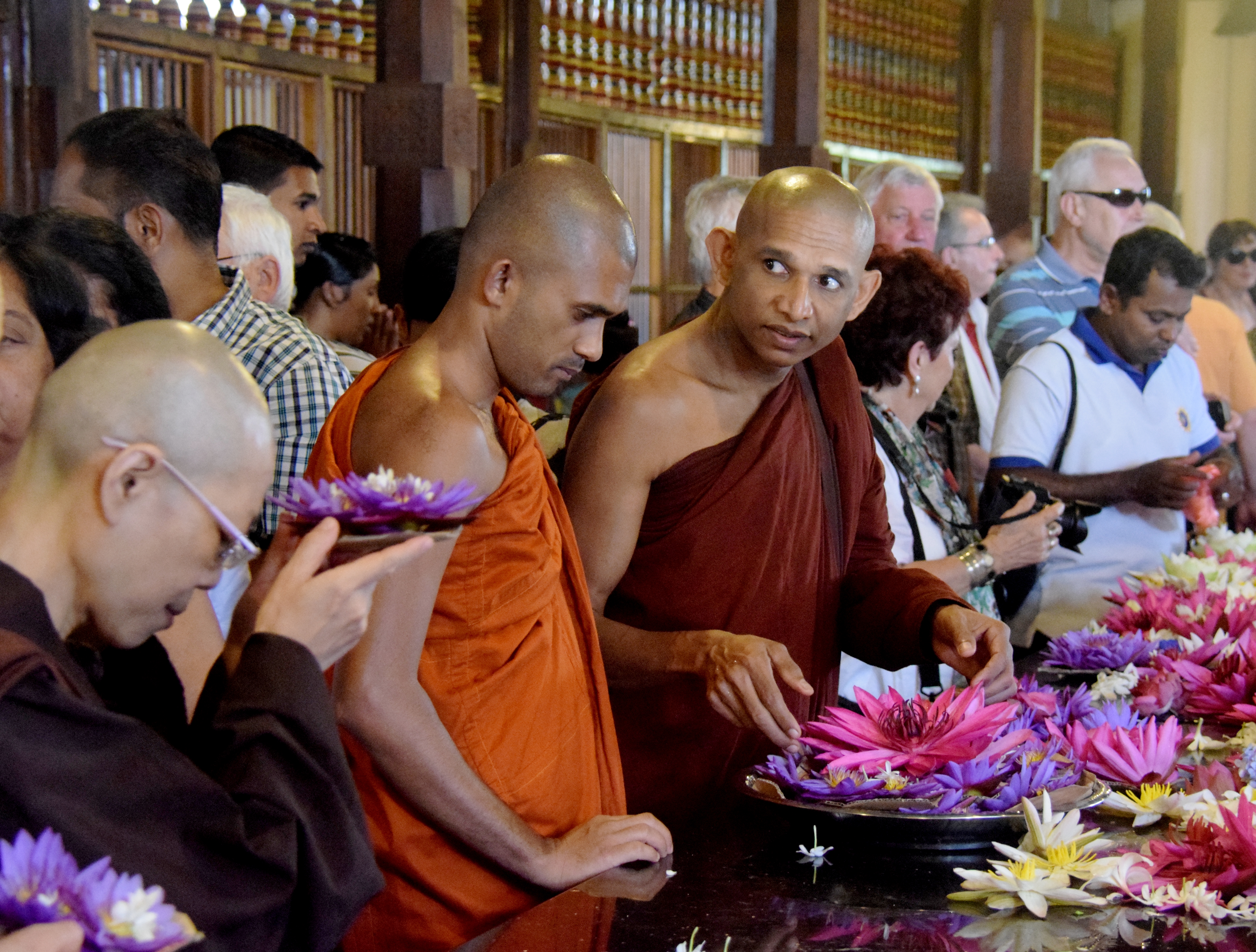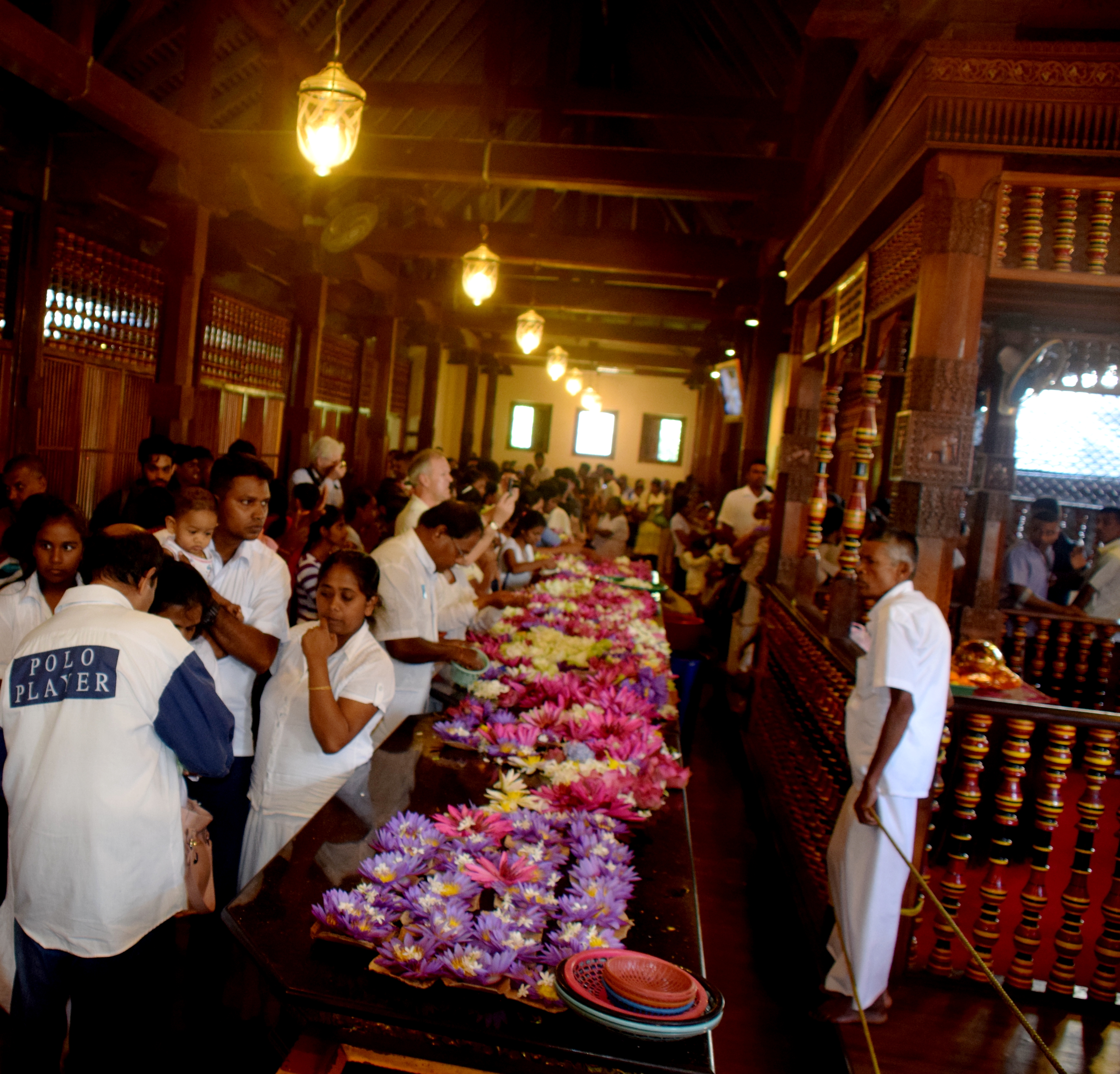 Depuis quelques jours nous sommes à Kandy, dernière étape de notre périple Sri Lankais. Cette ville était la capitale du dernier royaume cinghalais, elle s’articule autour d’un très beau lac autour duquel on peut se balader et croiser des varans énormes, des poisson-chats etc…les jeunes amoureux s’y retrouvent en fin de journée, le coucher de soleil sur le lac est magnifique !Autre intérêt de cette ville c’est le Temple de la Dent, une vraie dent de Bouddha ! Mais impossible de la voir, elle est enfermée dans un reliquaire en or qui contient 6 coffrets de taille décroissante. Le moment de la Puja (cérémonie qui a lieu trois fois par jour et qui dure une heure) était assez incroyable: des centaines de fidèles se ruent devant le reliquaire pour faire des offrandes, surtout des fleurs de jasmin ou de lotus, en priant. Beaucoup d’entre eux ont des nourrissons, y’a sûrement une sorte d’obligation religieuse à venir présenté son nouveau-né à cet endroit…
