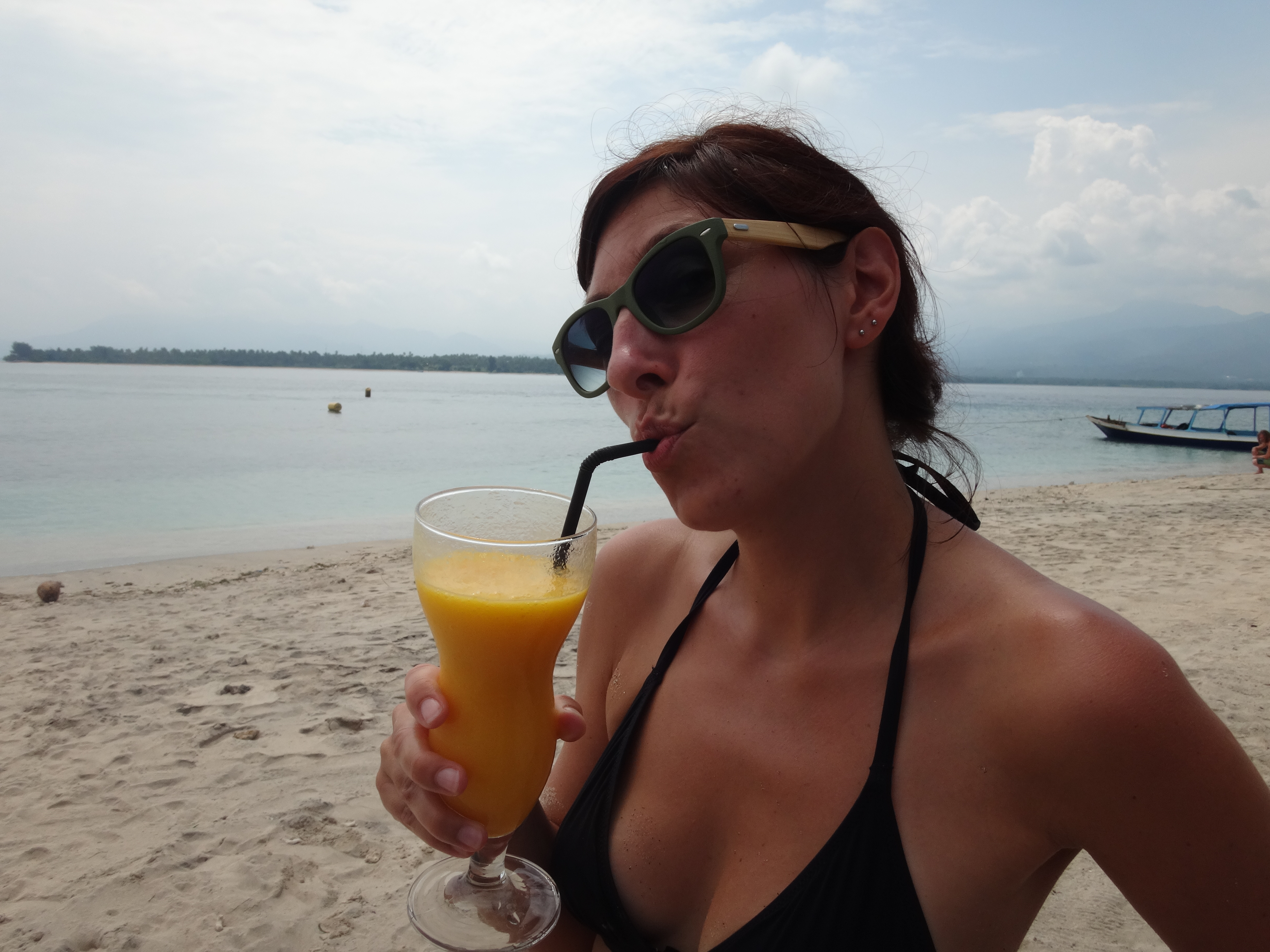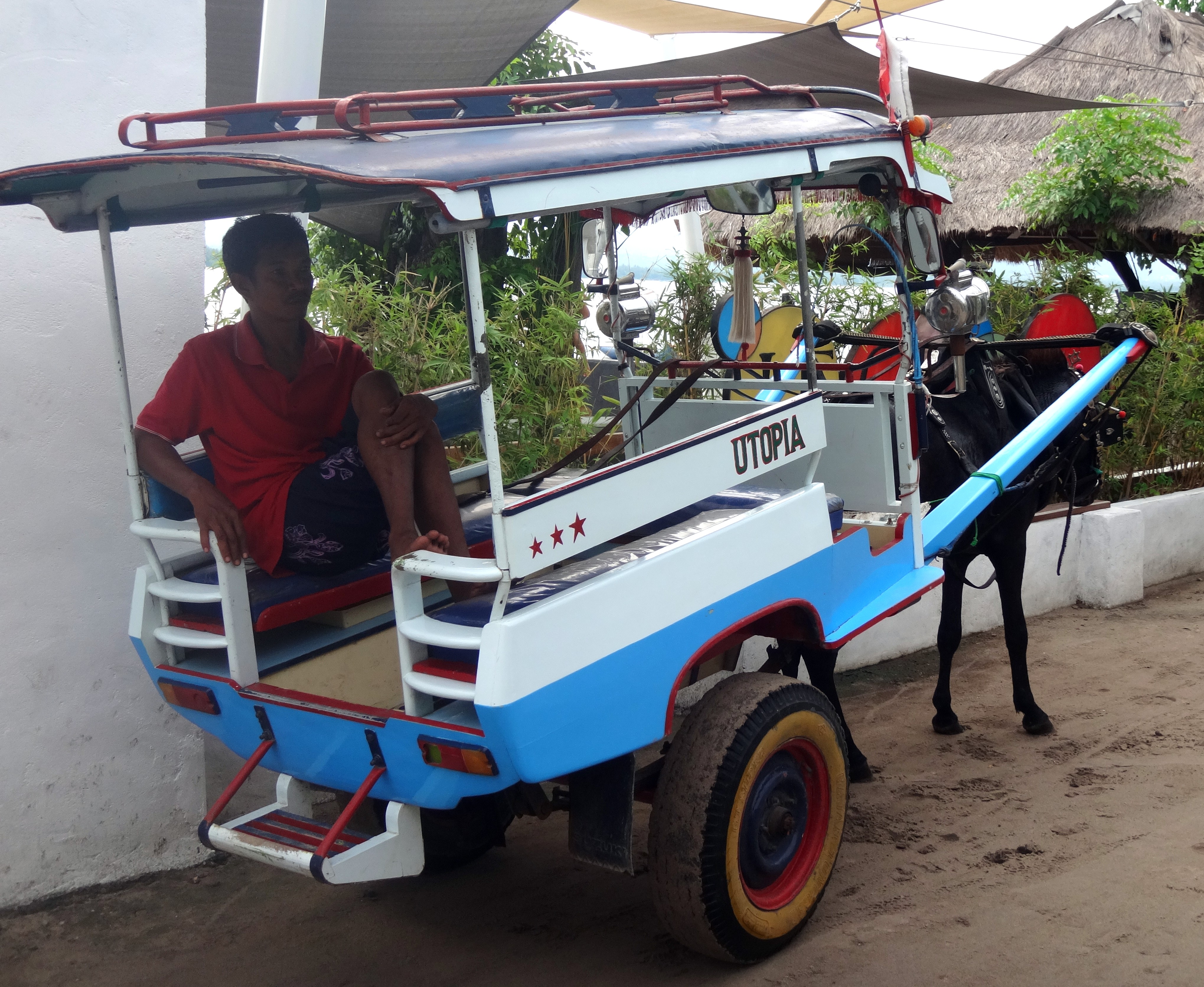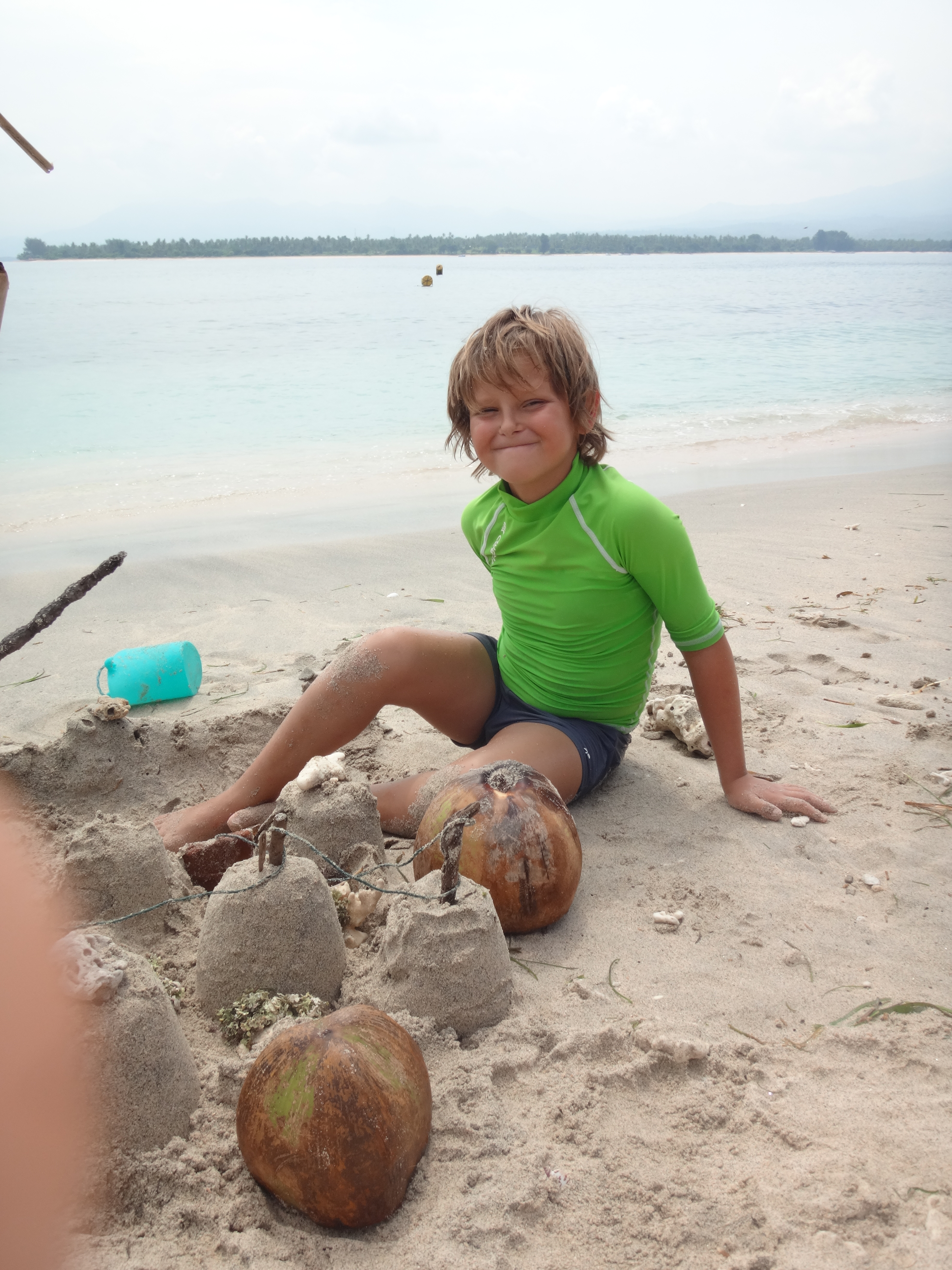Voilà donc 6 jours que nous sommes à Gili Air. Les îles Gili dépendent en fait de Lombok, il y en a 3: Gili T, la festive, ambiance djeuns et musique boum-boum; Gili Meno, celle du milieu, la moins développée et donc la plus calme et Gili Air, un mélange des deux ! Ici les Indonésiens sont musulmans, ils vivent de la pêche, de la noix de coco et de plus en plus du tourisme. Quoique qu’en saison des pluies des touristes y’en n’a pas des masses et ça nous arrange bien ! L’ambiance est cool, pas de voitures, pas de scooters, pas de chiens et pas de coqs ! Le rêve !