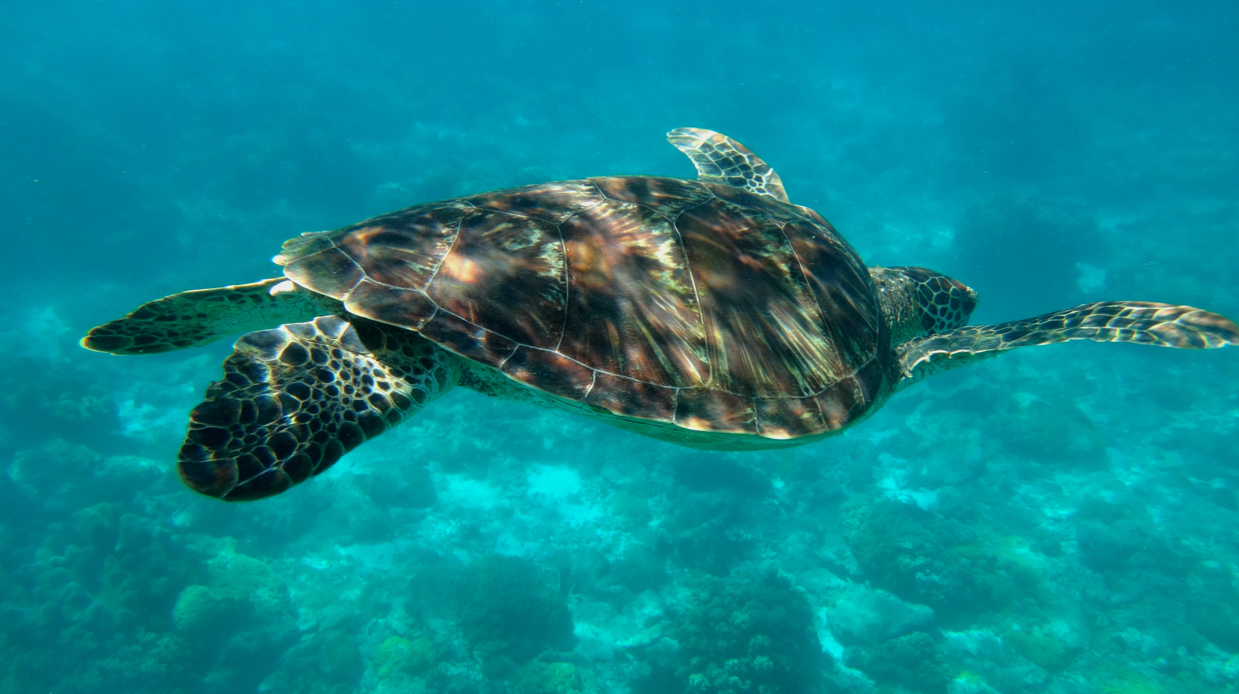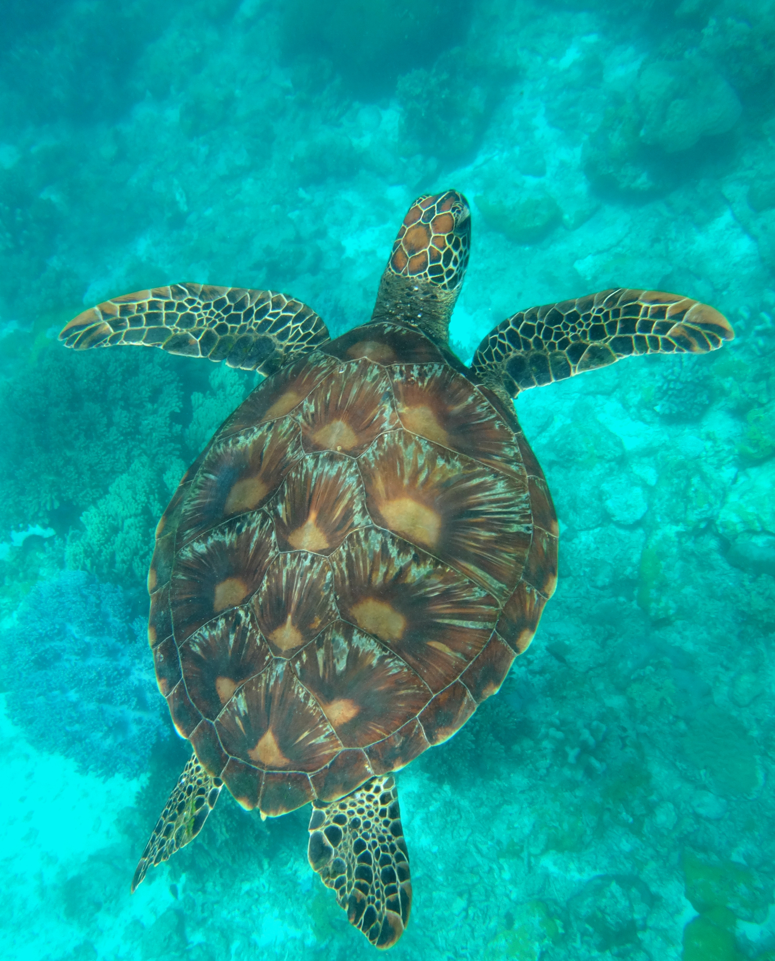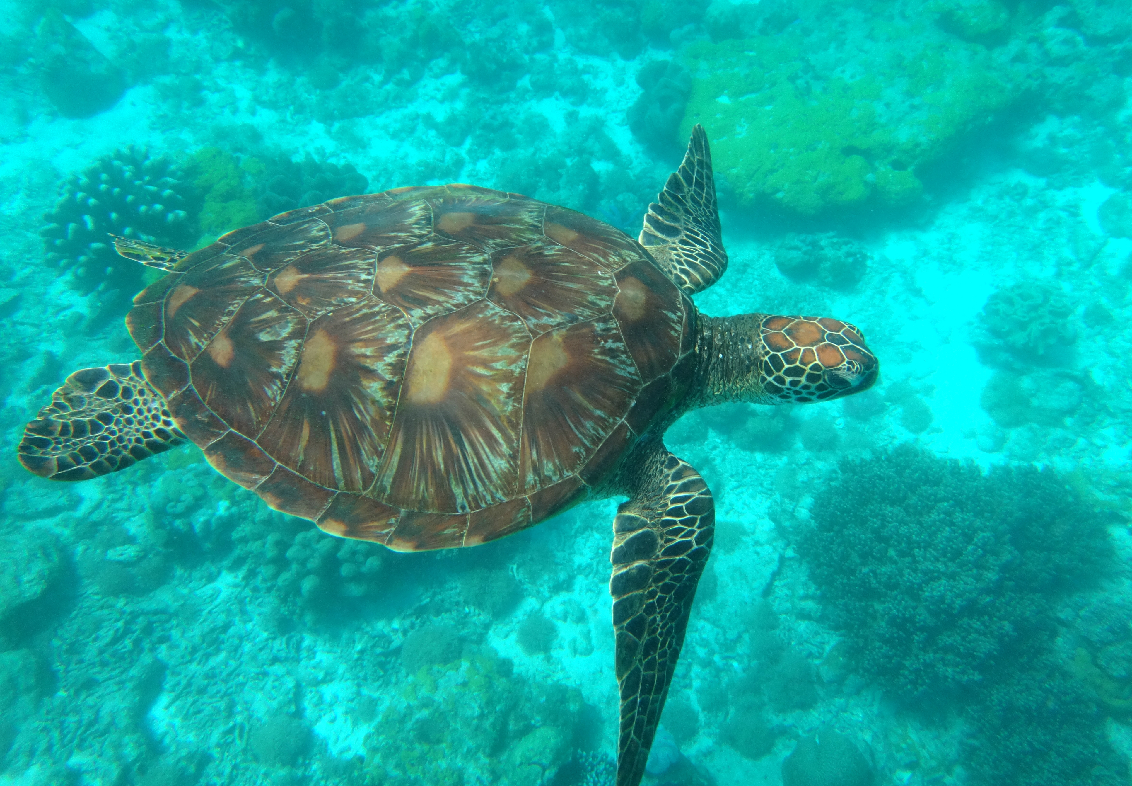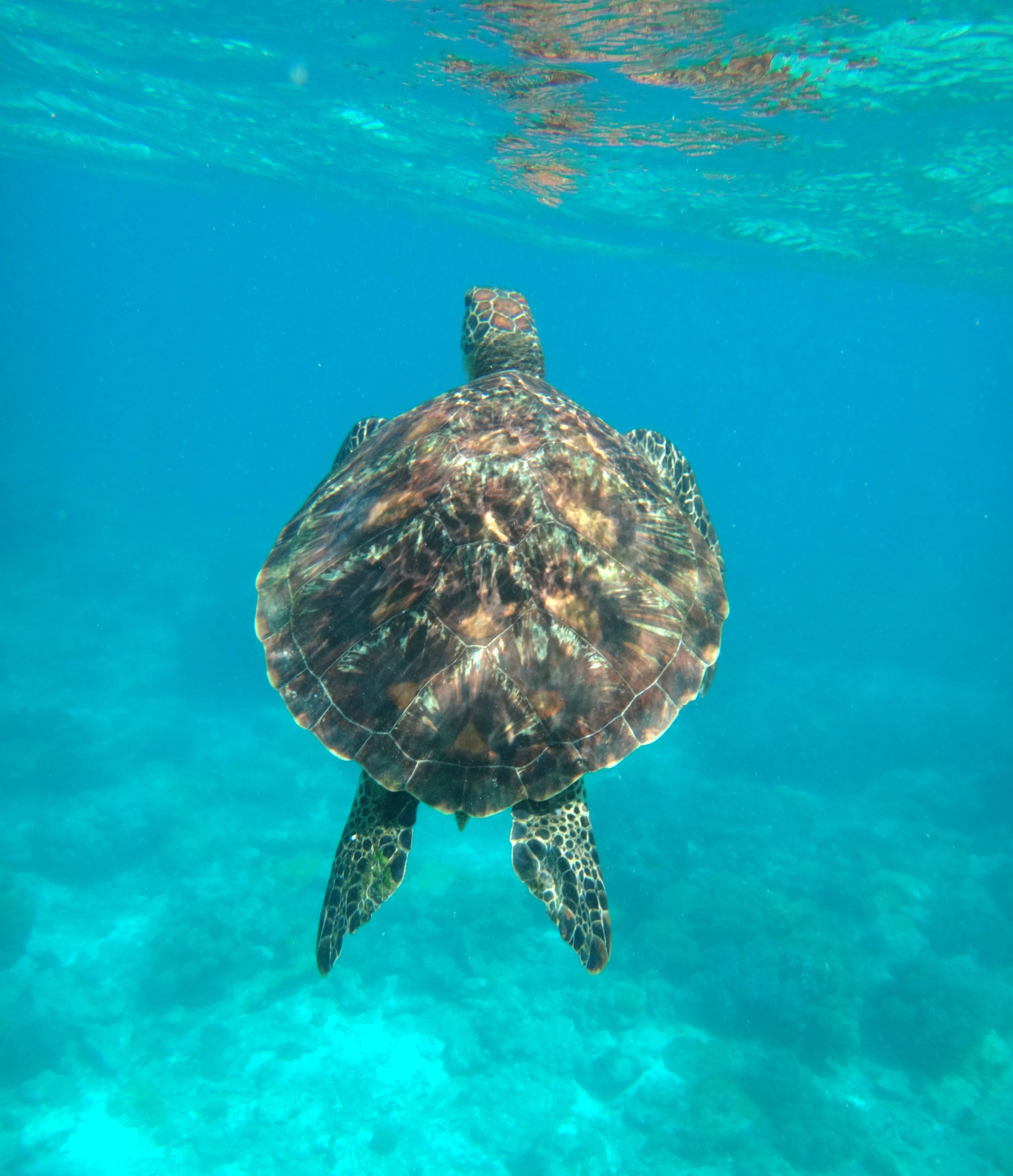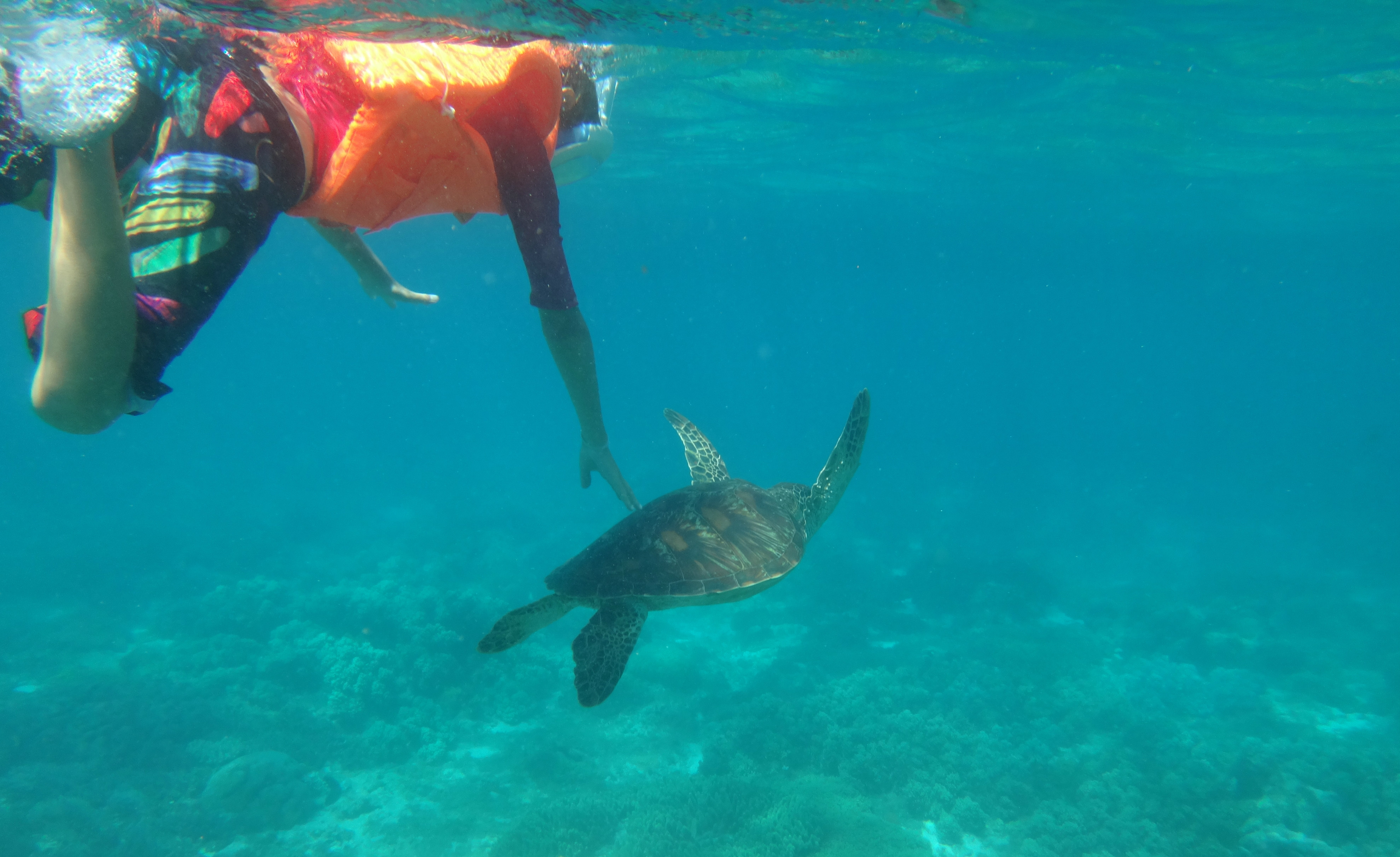 J’ai vu les tortues vertes dans l’eau avec mon masque et mon tuba. Pendant 20 minutes mon papa et moi en avons suivi une petite. Elle nageait tout doucement à côté de moi, j’ai même pu la toucher ! Elle mangeait des petites algues au sol puis remontait respirer à la surface. On a eu beaucoup de chance, elle n’avait pas l’air d’avoir peur du tout. On l’a prise en photo avec notre appareil qui va sous l’eau. C’était génial !!!!
