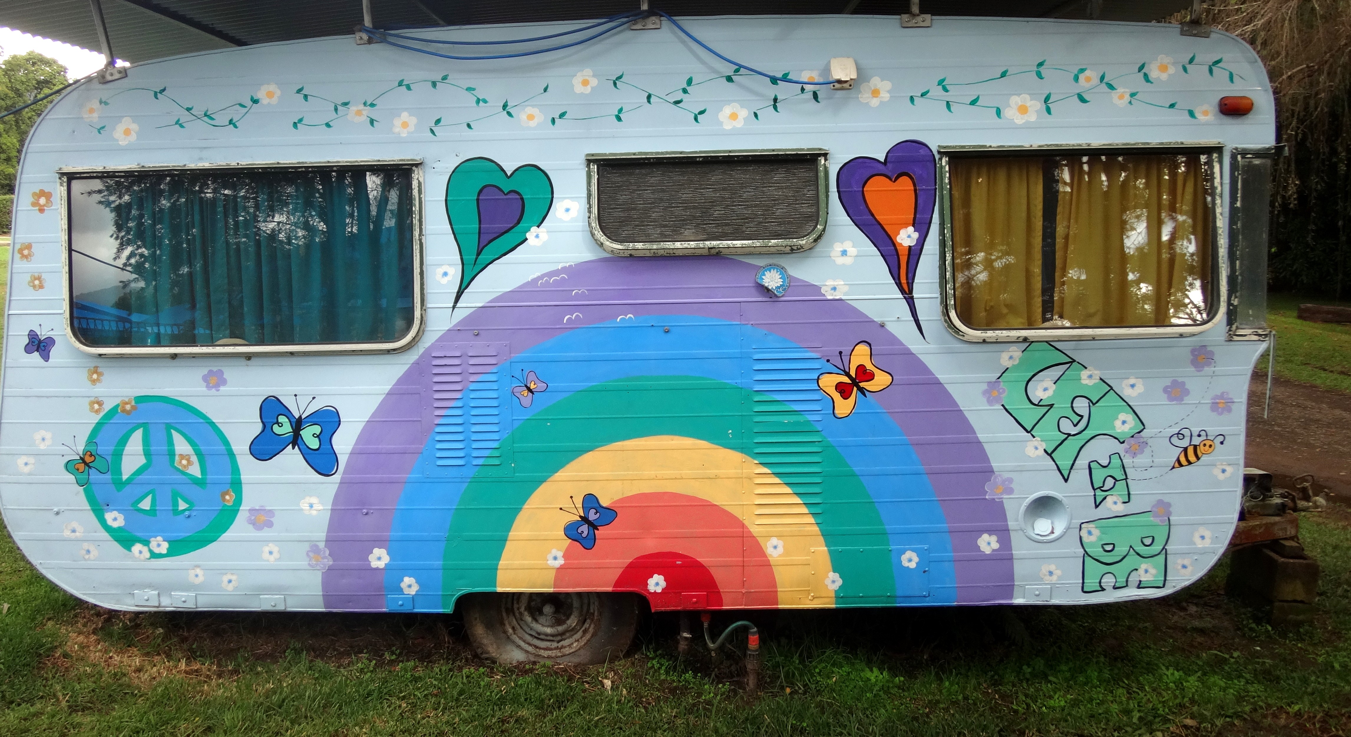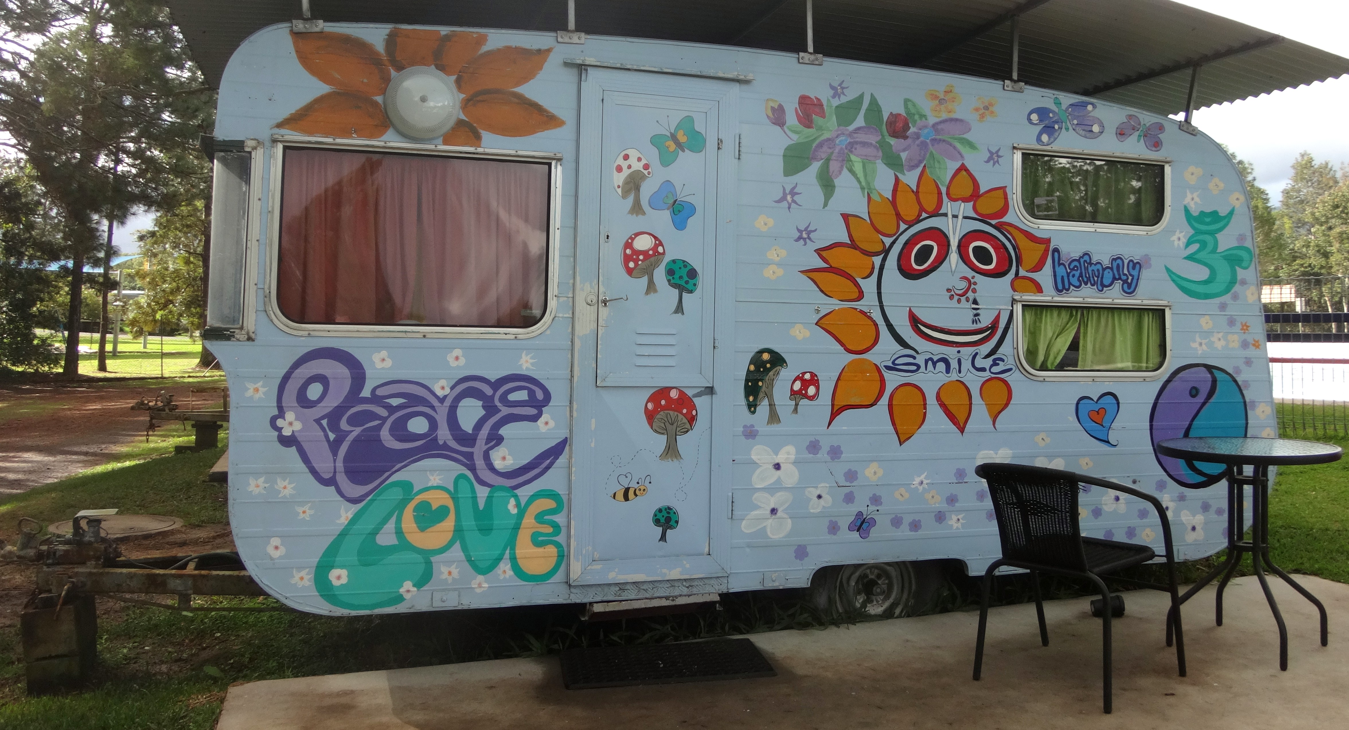 On a ensuite fuit la pluie pour rejoindre l’intérieur des terres et aller jusqu’à Nimbin. Alors là on a fait un bond dans le temps d’environ 40 ans, ambiance Seventies !