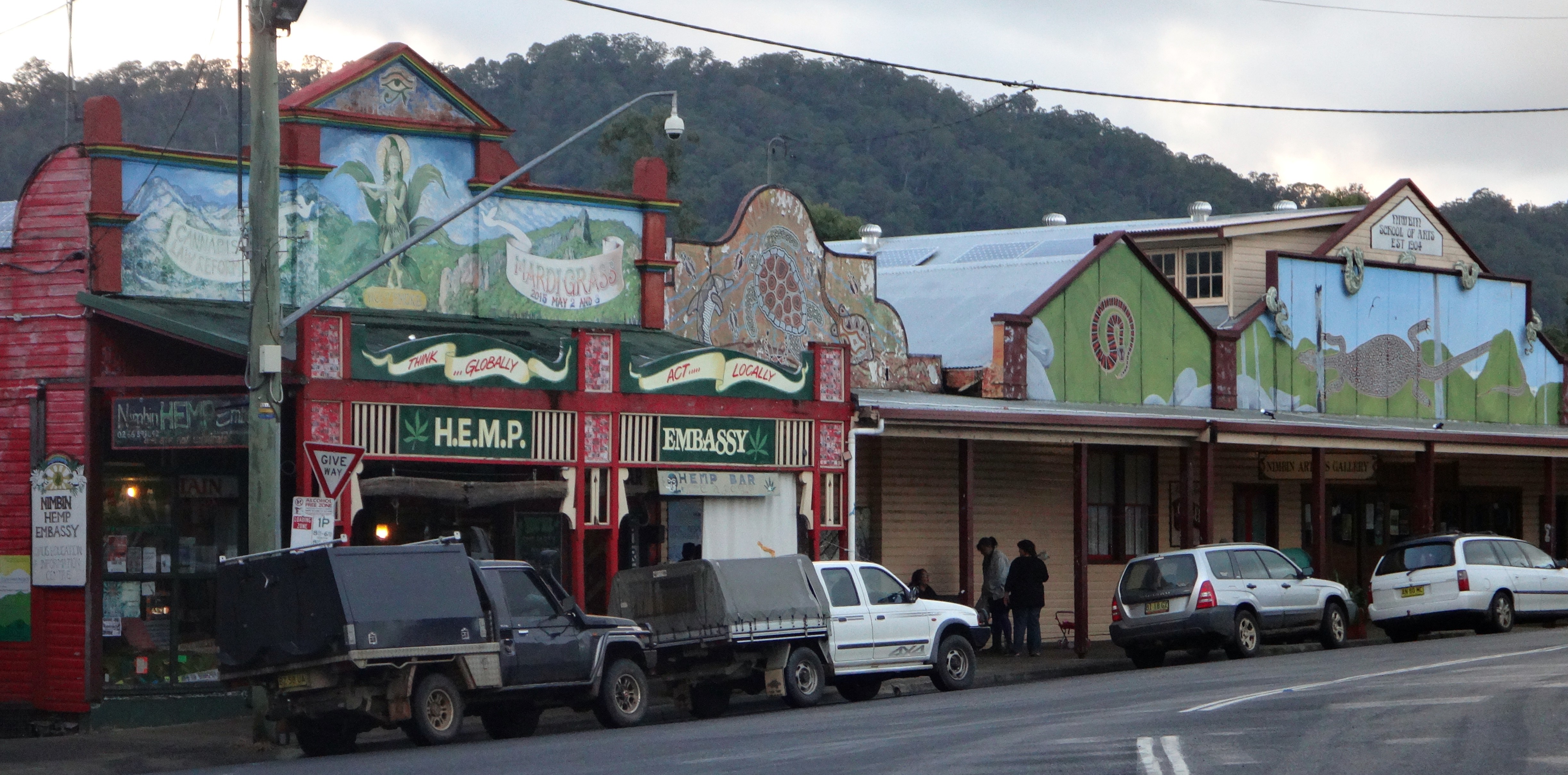 La ville n’a pas l’air d’avoir vraiment changé depuis ! Ici pas de Mairie mais un Centre Communautaire, et une lutte affichée pour la dépénalisation du cannabis, la loi australienne n’a pas l’air de s’y appliquer étant donné les effluves senties dans les rues !!!