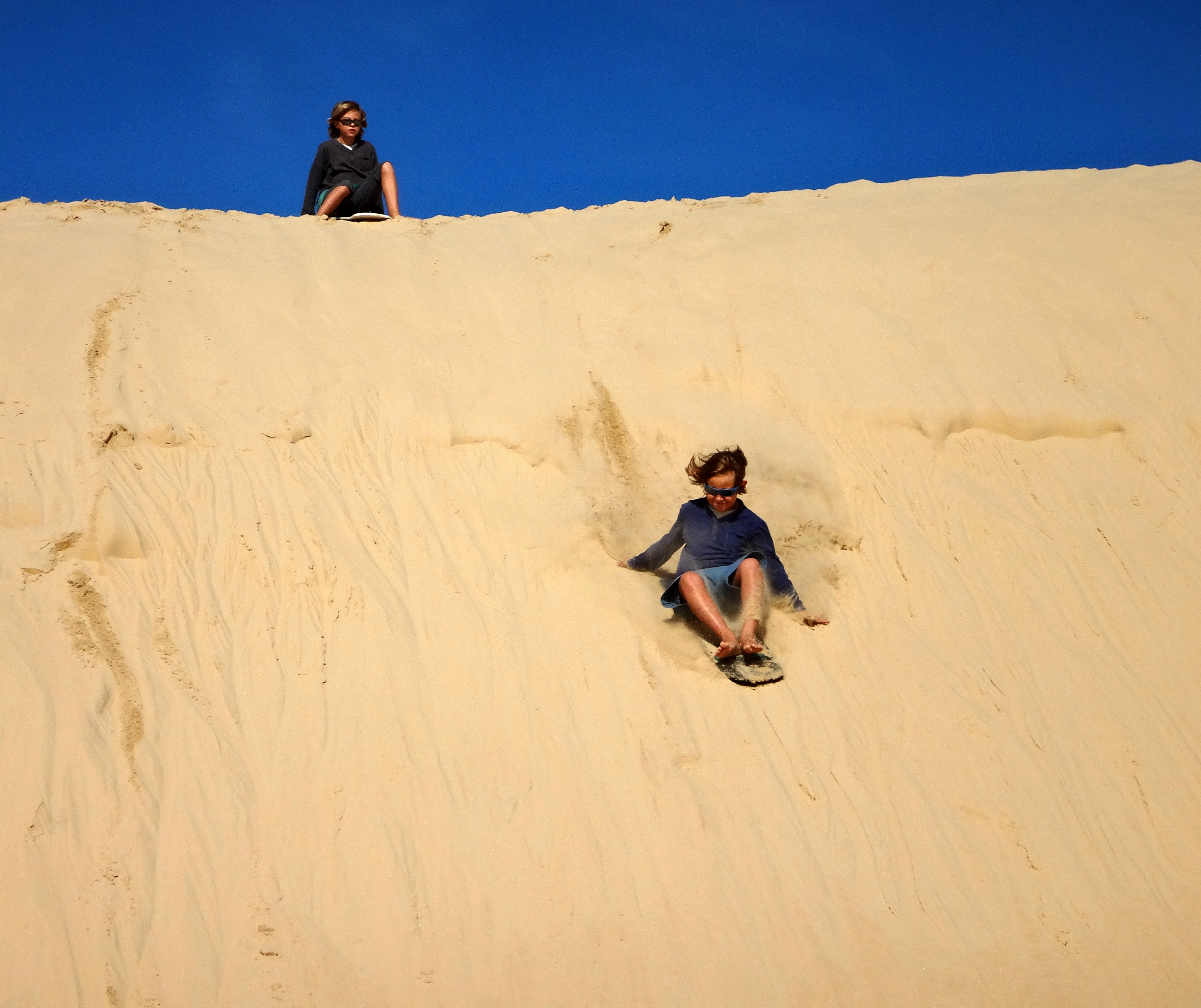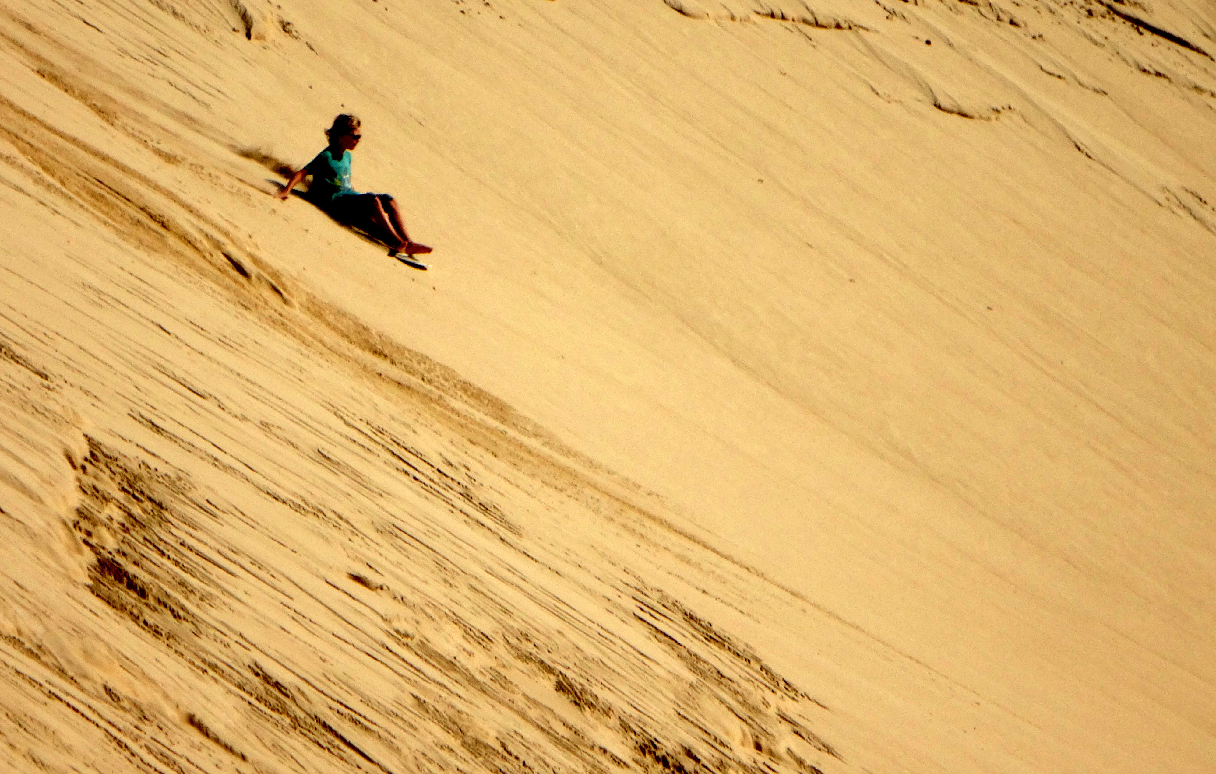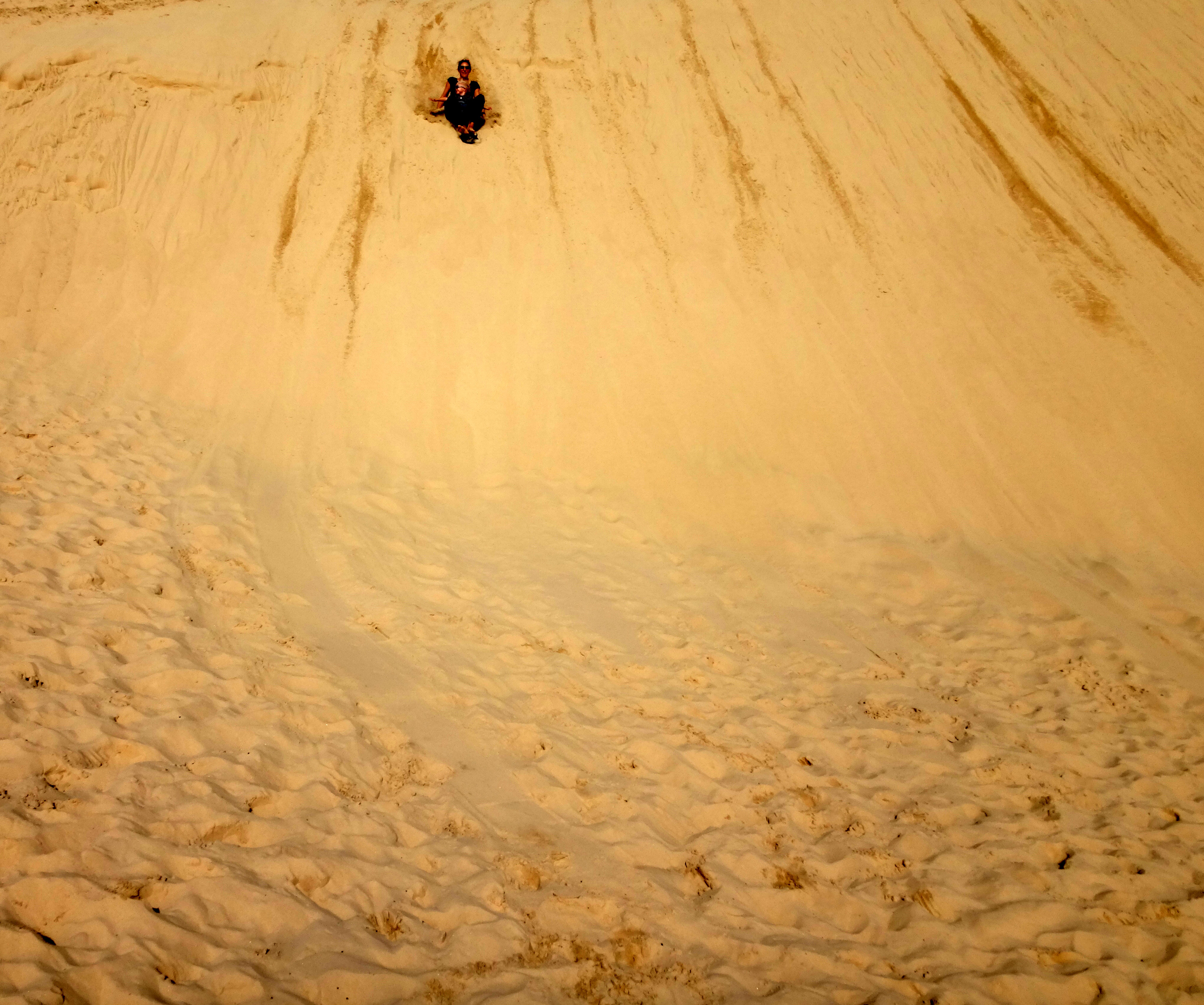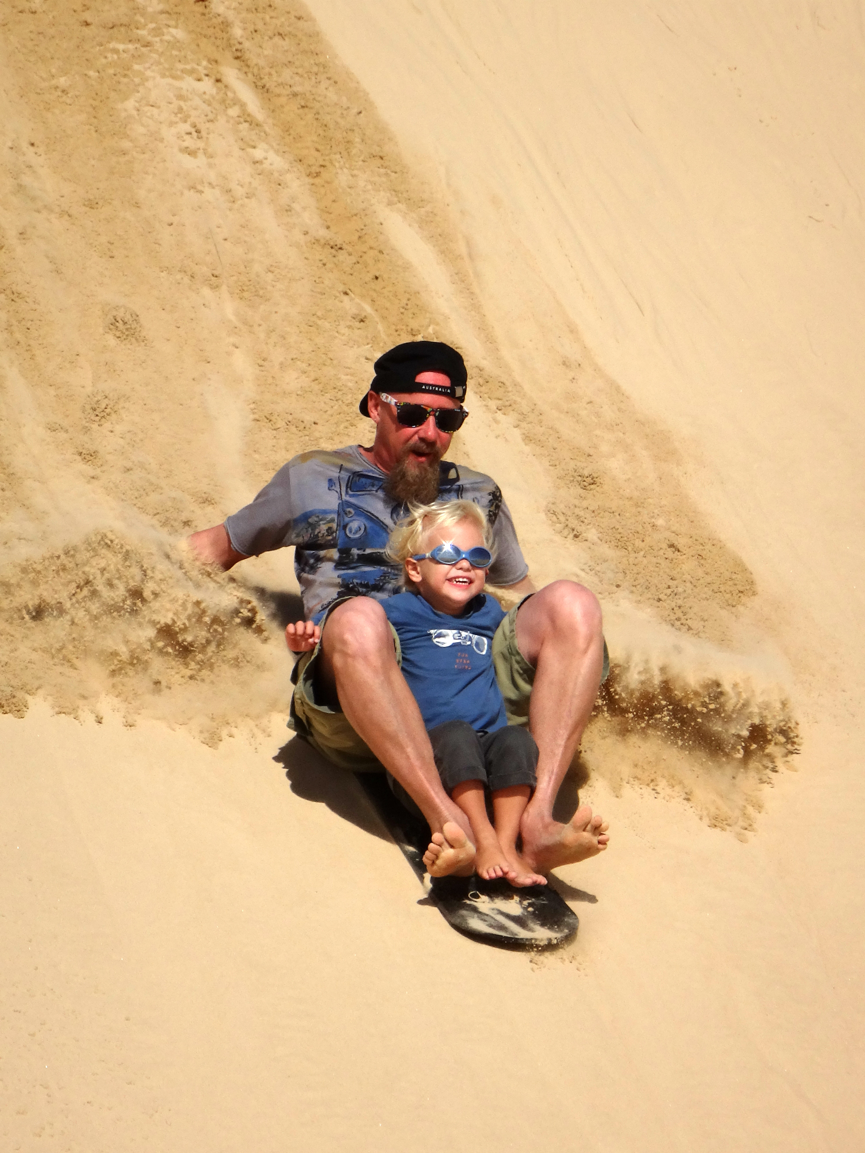 Retour sur la côte pour retrouver un peu de chaleur, direction Anna Bay pour aller aux Worimi Conservation Lands, ce sont les dunes de sables mouvantes les plus longues de l’hémisphère Sud, elles appartiennent au peuple aborigène Worimi qui en gère l’accès. A certains endroits on ne voit plus la plage, on se serait crus en plein Sahara ! Pour aller au milieu de ces dunes nous avons pris un mini-bus 4X4, et histoire de rigoler un peu on a fait du Sandboard, une planche hybride qui permet d’aller super vite !
