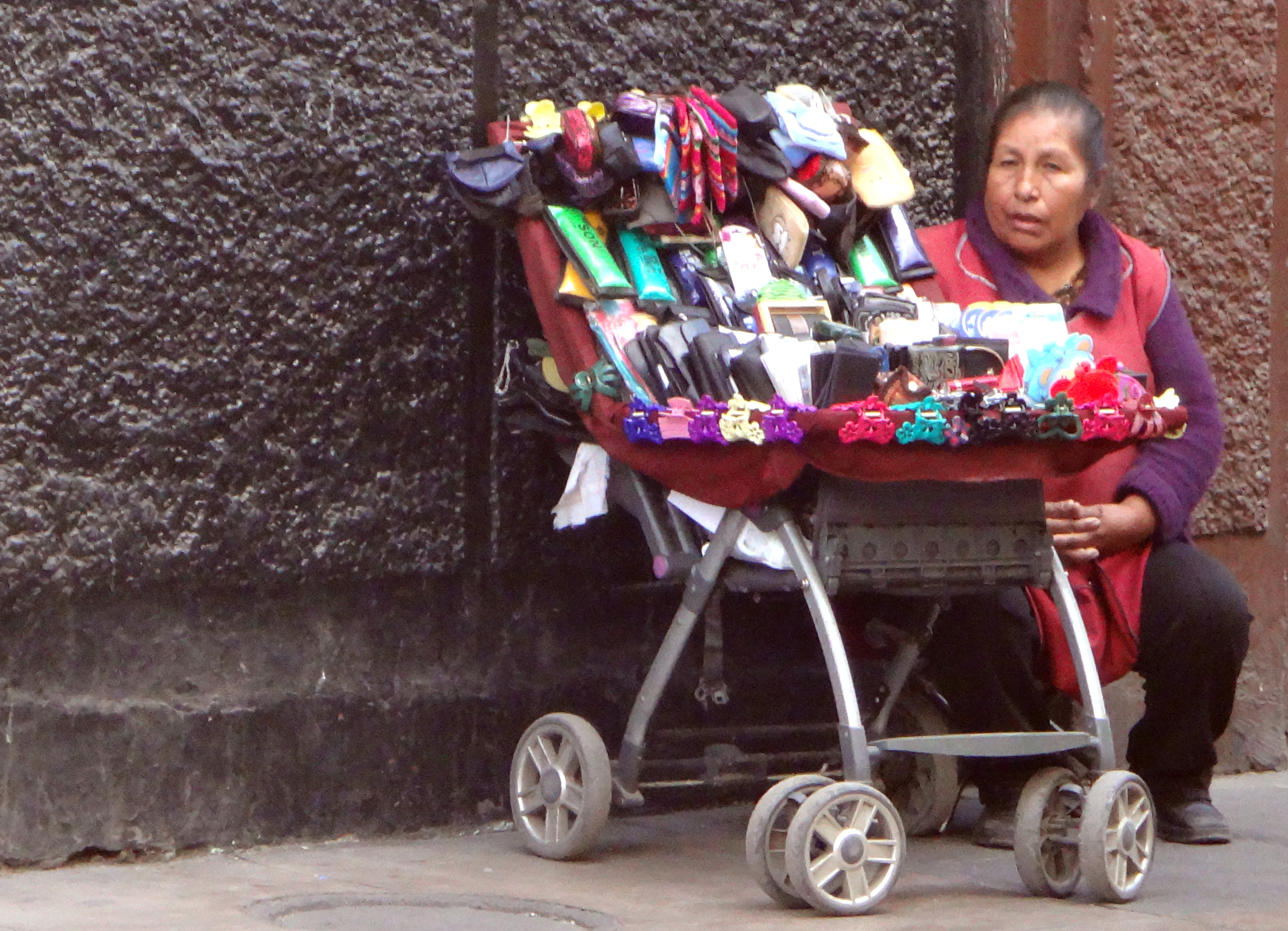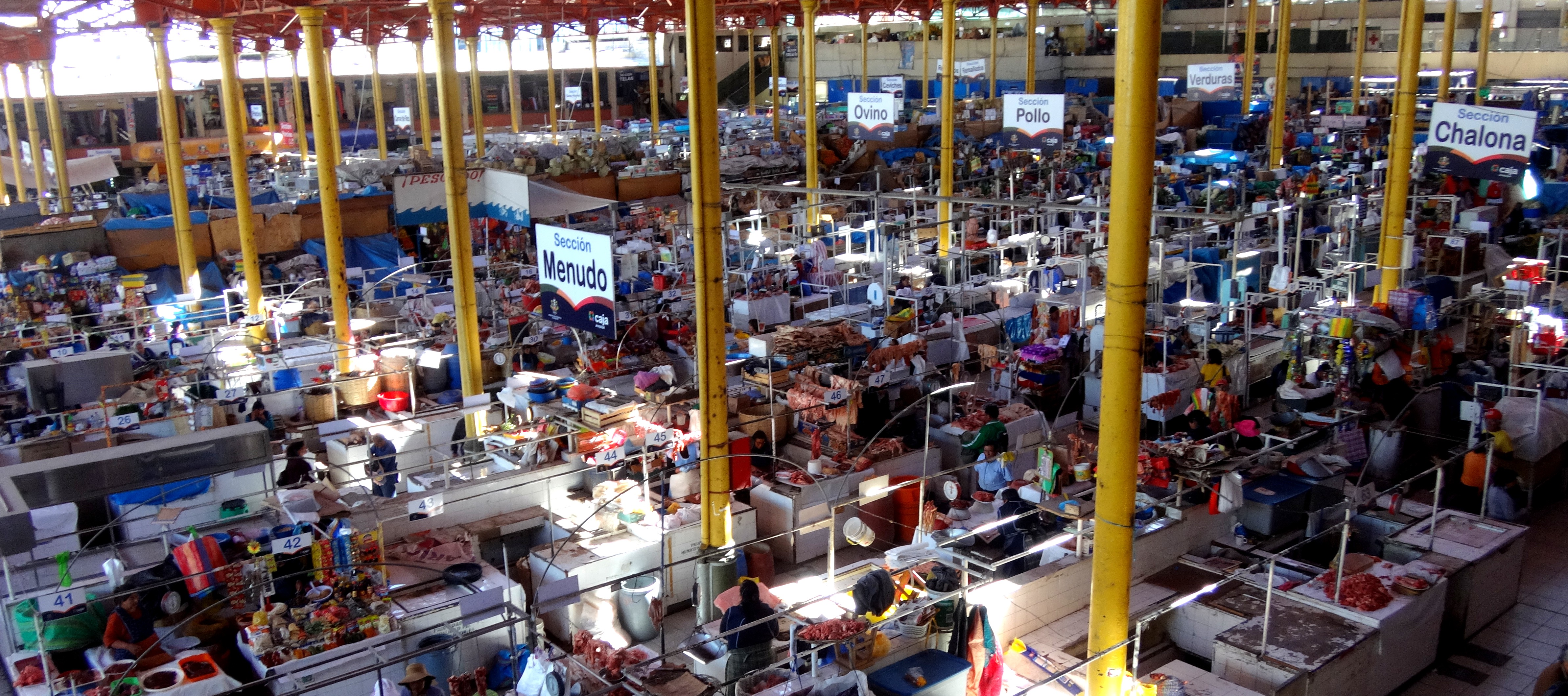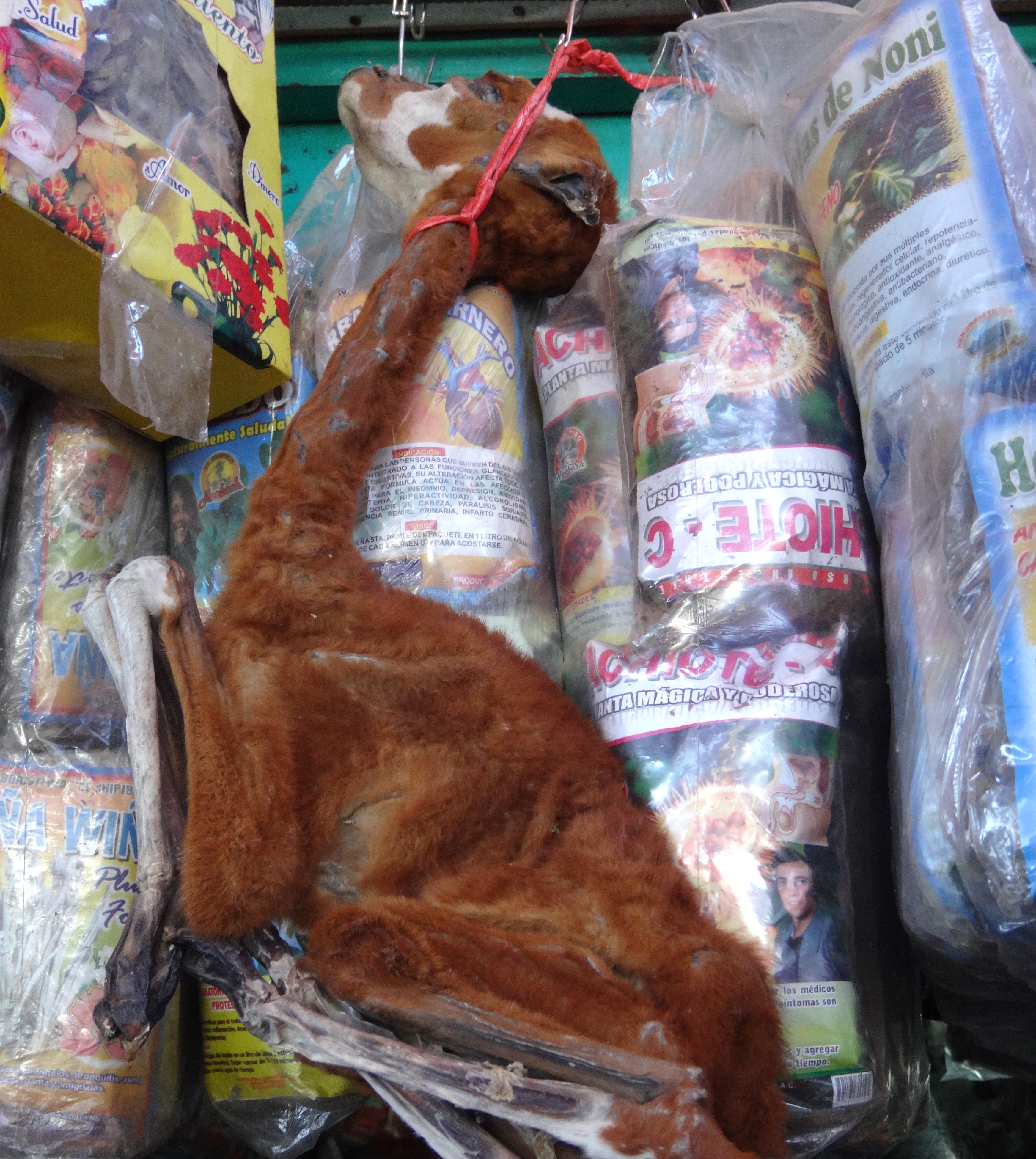Comme à notre habitude nous avons été voir le marché: Mercado San Camillo. Bizzarement ils n’en parlent pas dans le Lonely Planet, nous étions donc les seuls touristes, c’est pourtant un endroit plein de vie, on a passé une super matinée à arpenter les allées de fruits, légumes, tissus…un peu plus dur de passer par les viandes et poissons ! Il y a aussi plusieurs allées avec des sorcières (dixit Teva !) où sont exposés des herbes diverses, des cierges de toutes les couleurs et de toutes les tailles, des statuettes de toutes sortes, des gri-gri, mais aussi des offrandes d’animaux non identifiés à plumes ou à poils, des fœtus de lamas, apparemment ils doivent être déposés dans les fondations d’une maison pour porter chance à ses habitants…