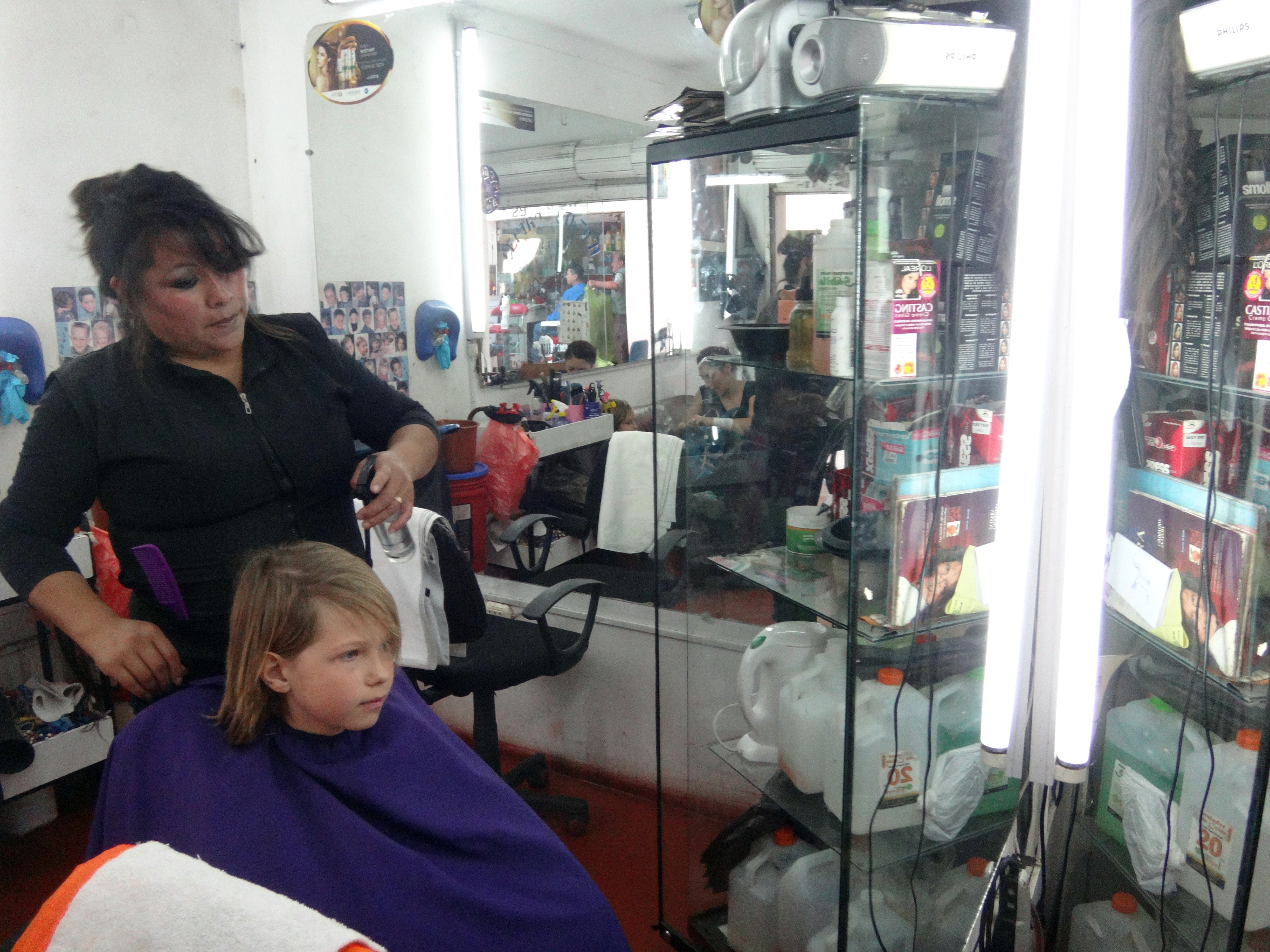Il y a aussi une allée avec des coiffeurs, Tao a sauté sur l’occas’ pour tout ratiboiser, marre de ses cheveux longs (et des poux, qui ne nous quittent pas depuis les Philippines !)