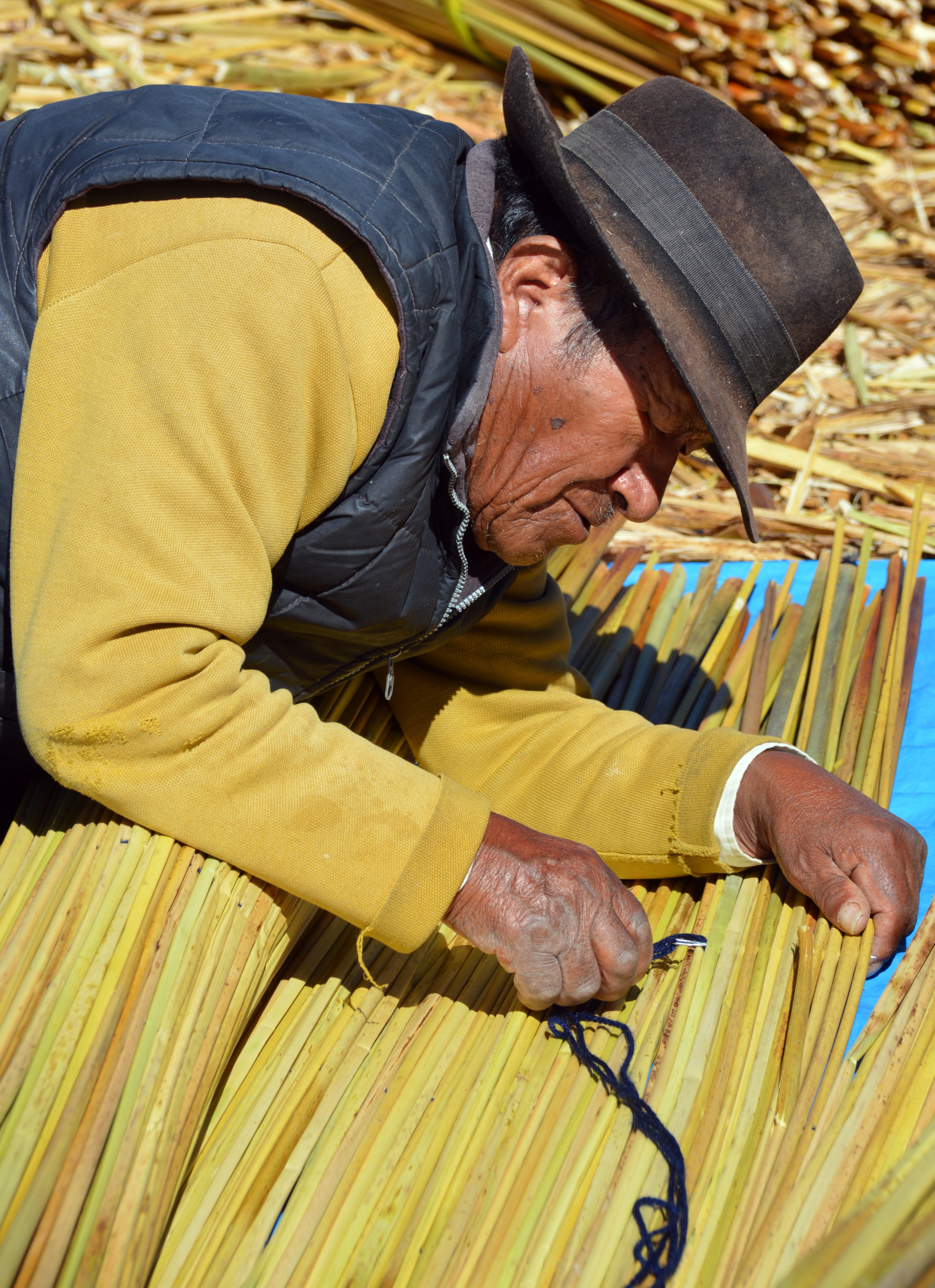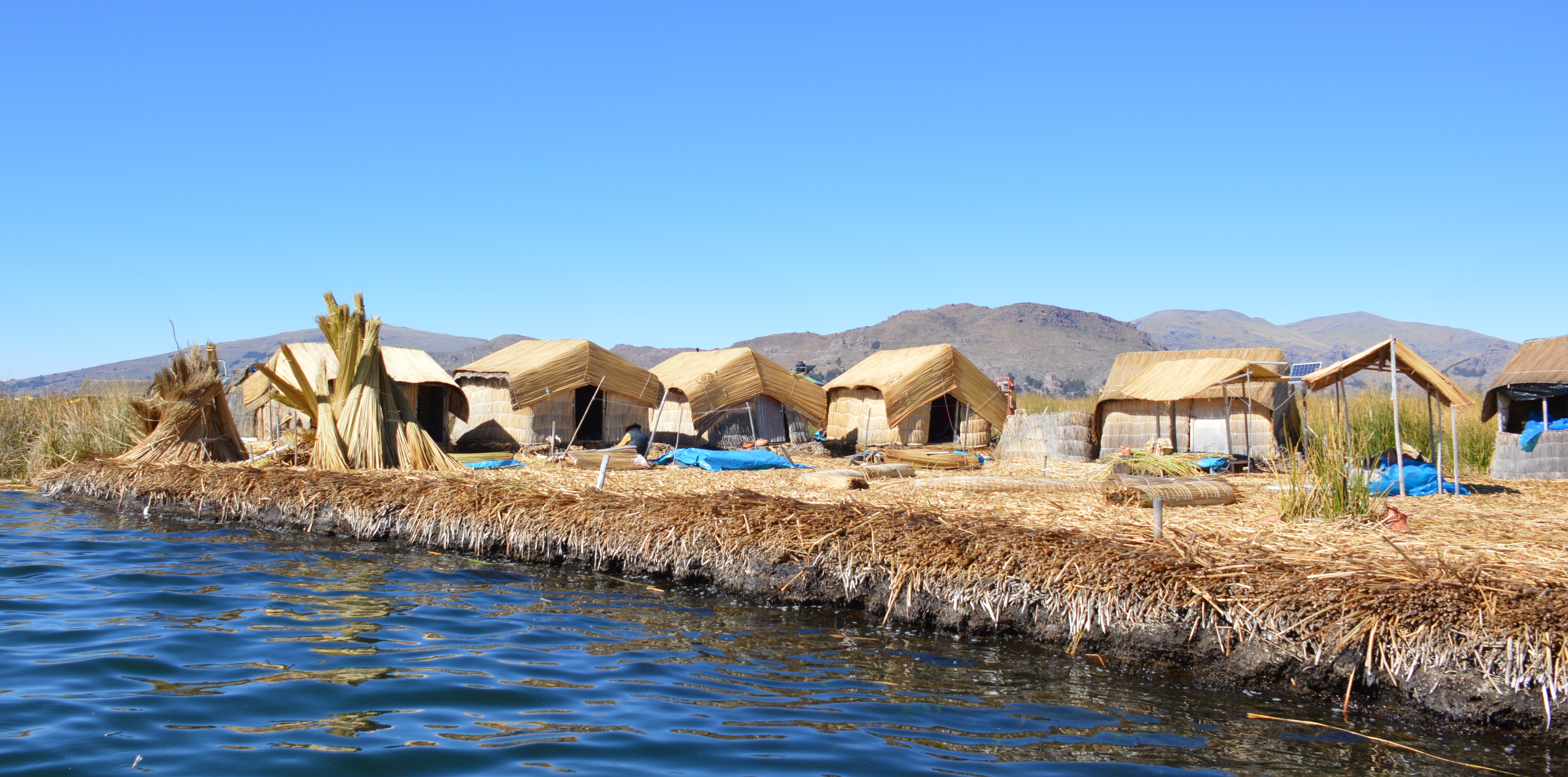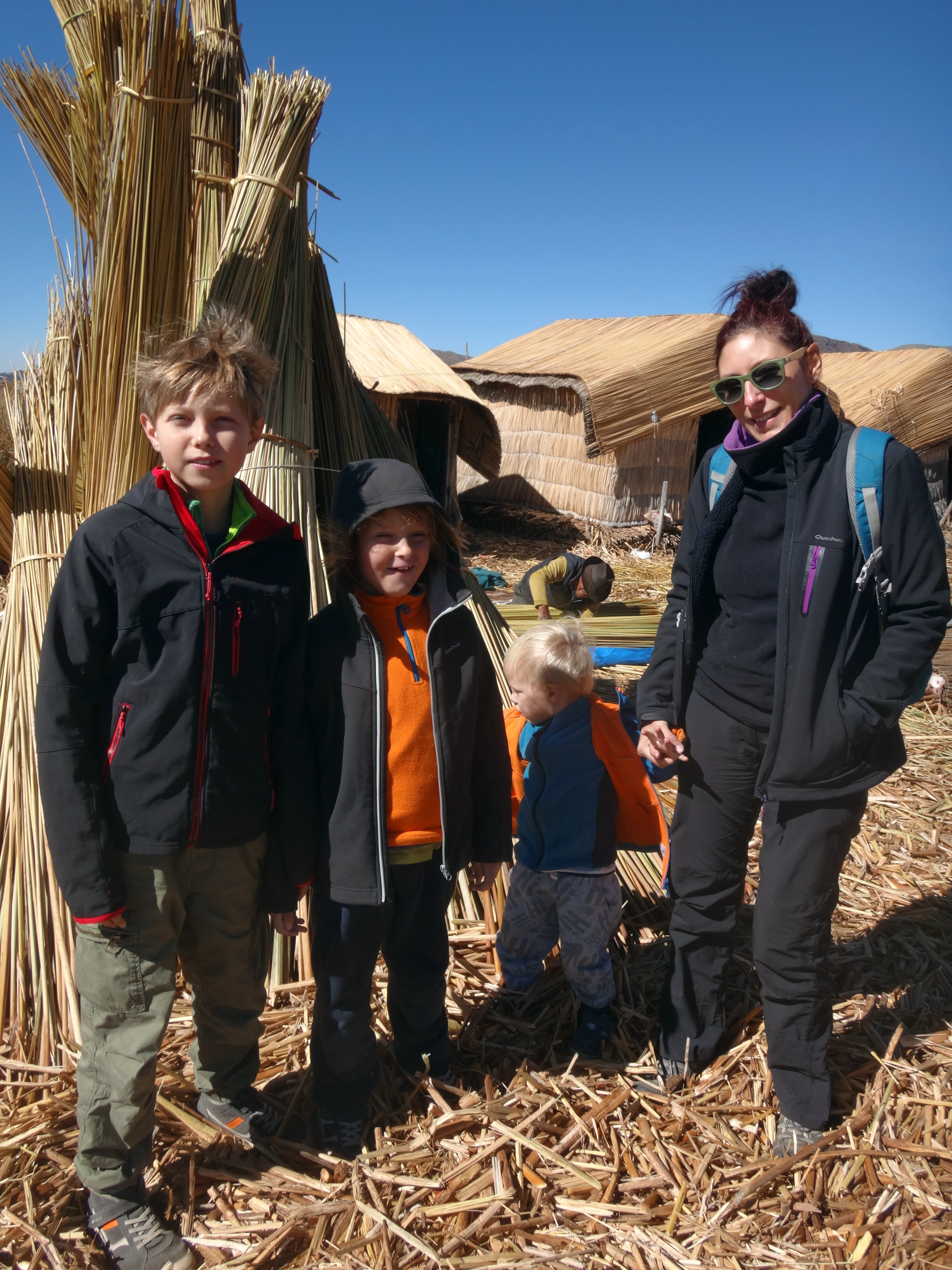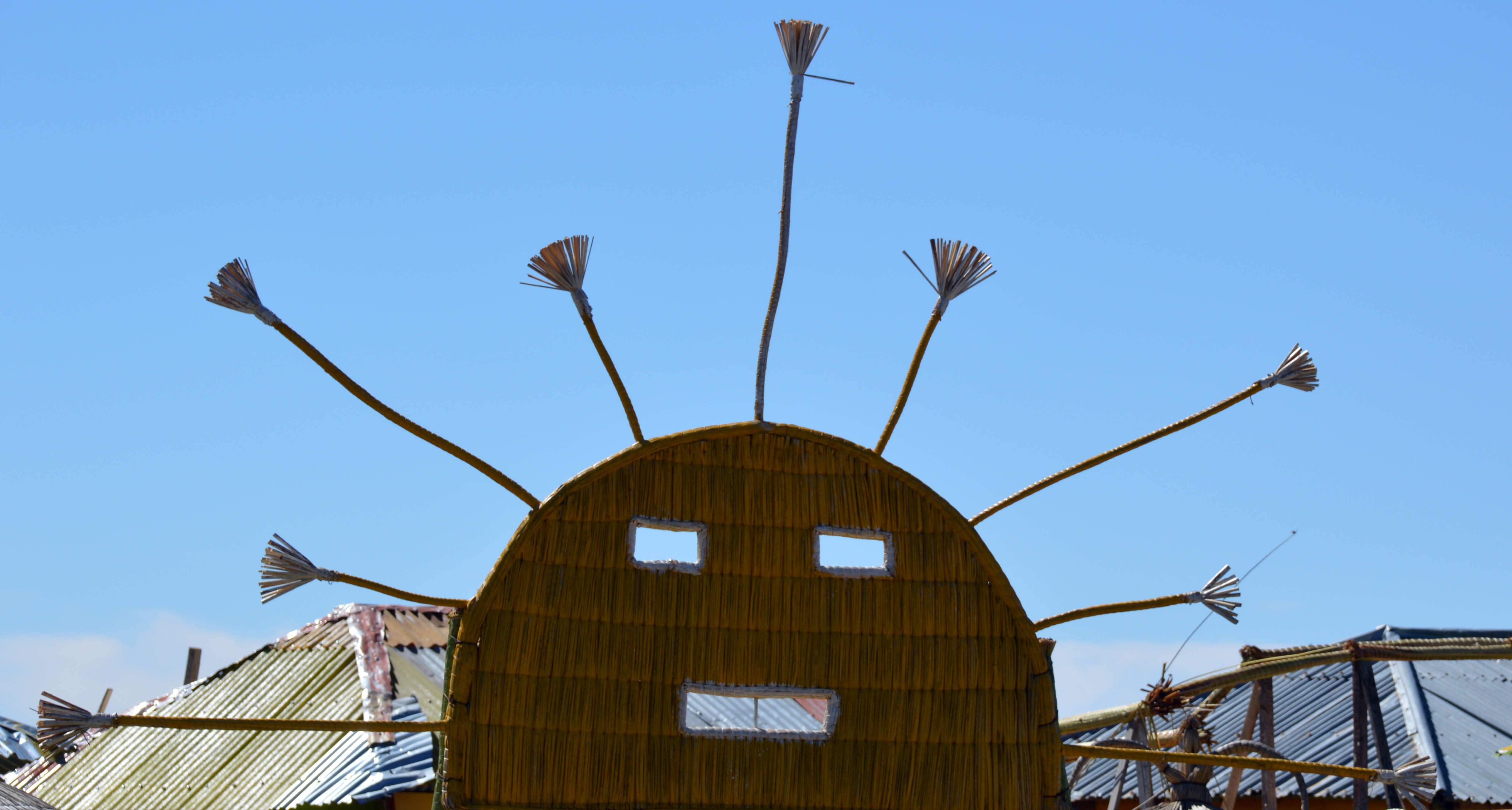 Ces îles sont construites grâce à plusieurs couches de totora (sorte de roseaux). Tous les 2 ou 3 mois il faut rajouter une couche car ça pourri par le fond au fur et à mesure, c’est ce pourrissement et les racines qui se développent autour qui permettent à l’île de flotter, elles sont ancrées par des pieux afin de ne pas trop se balader.