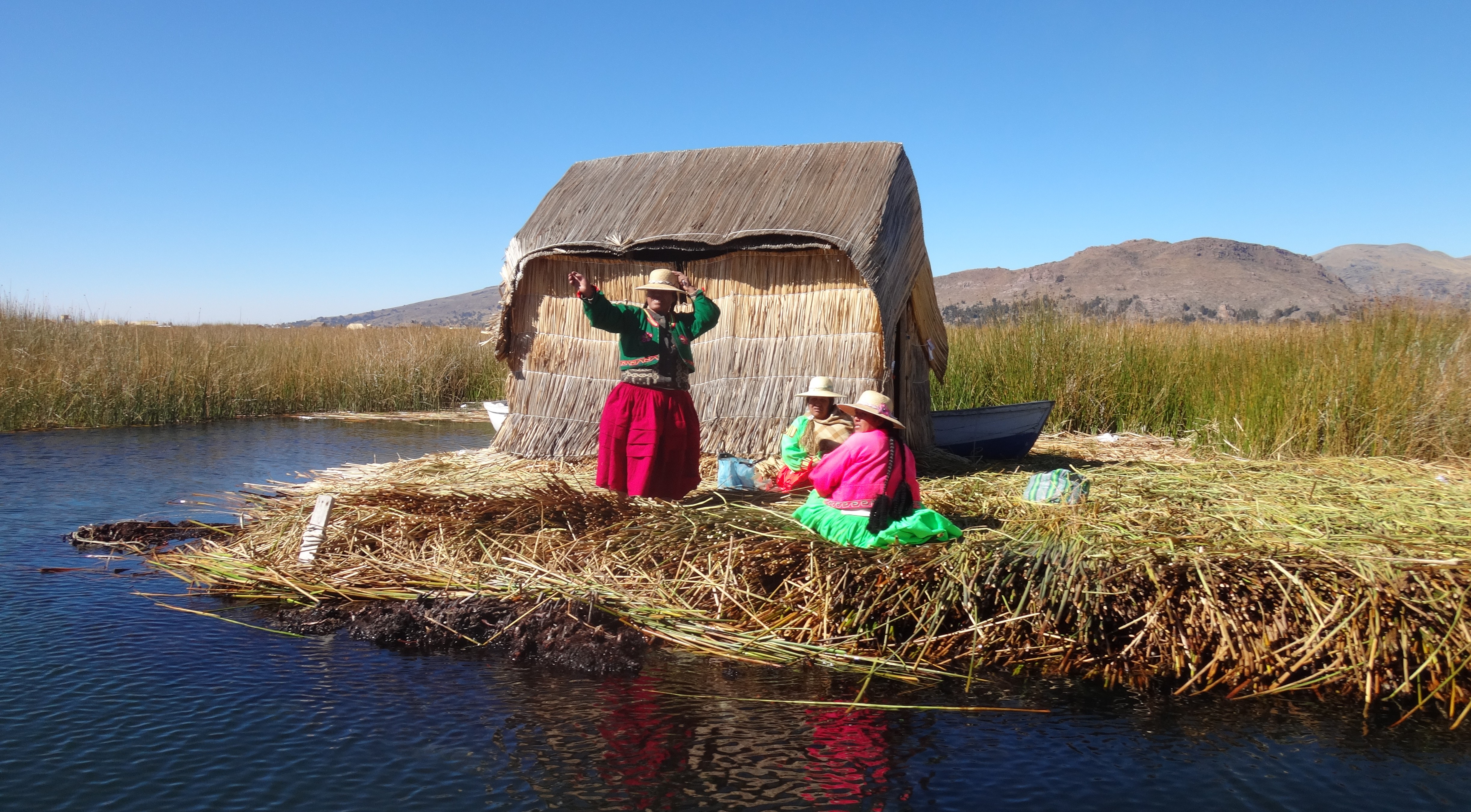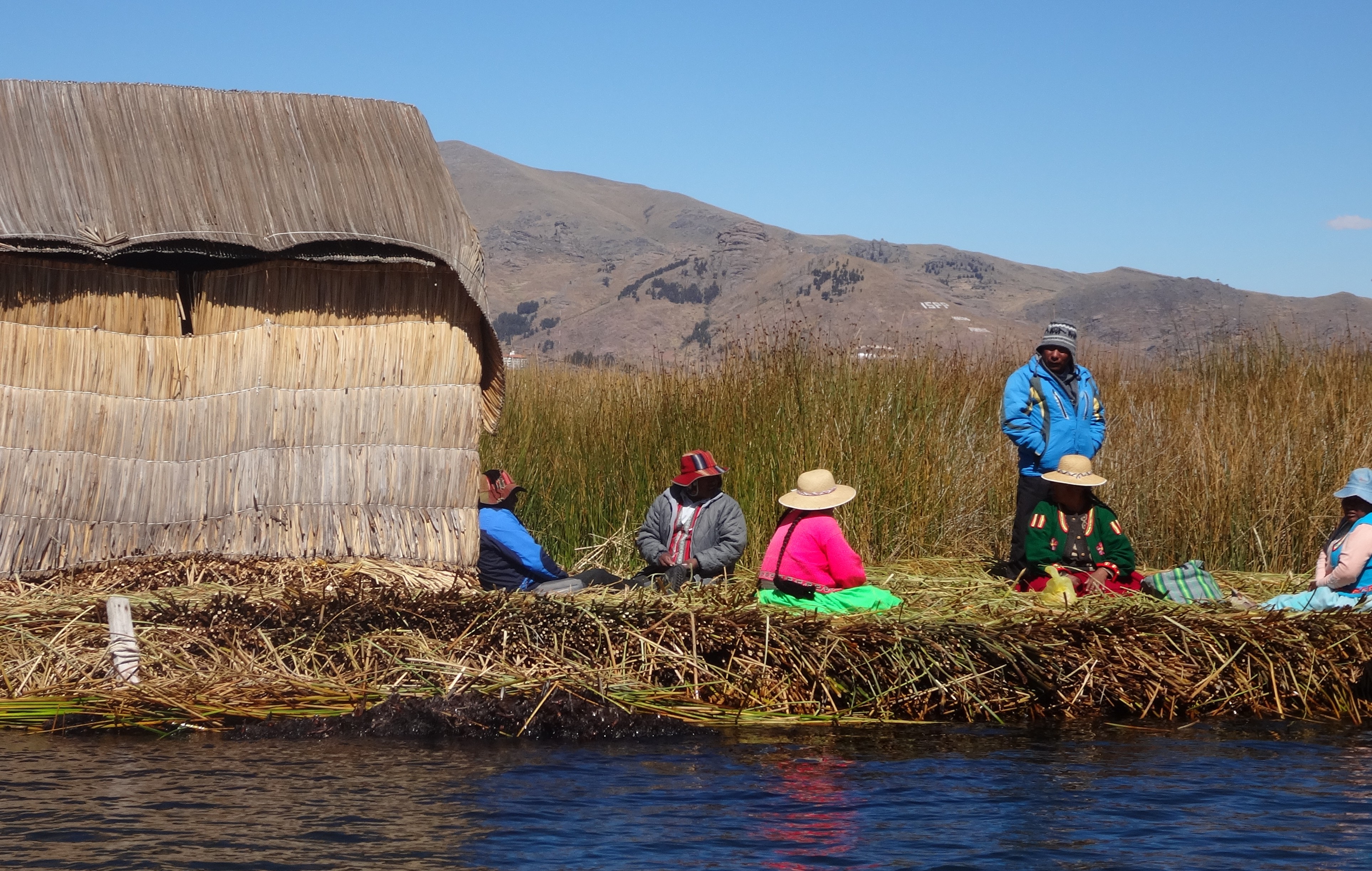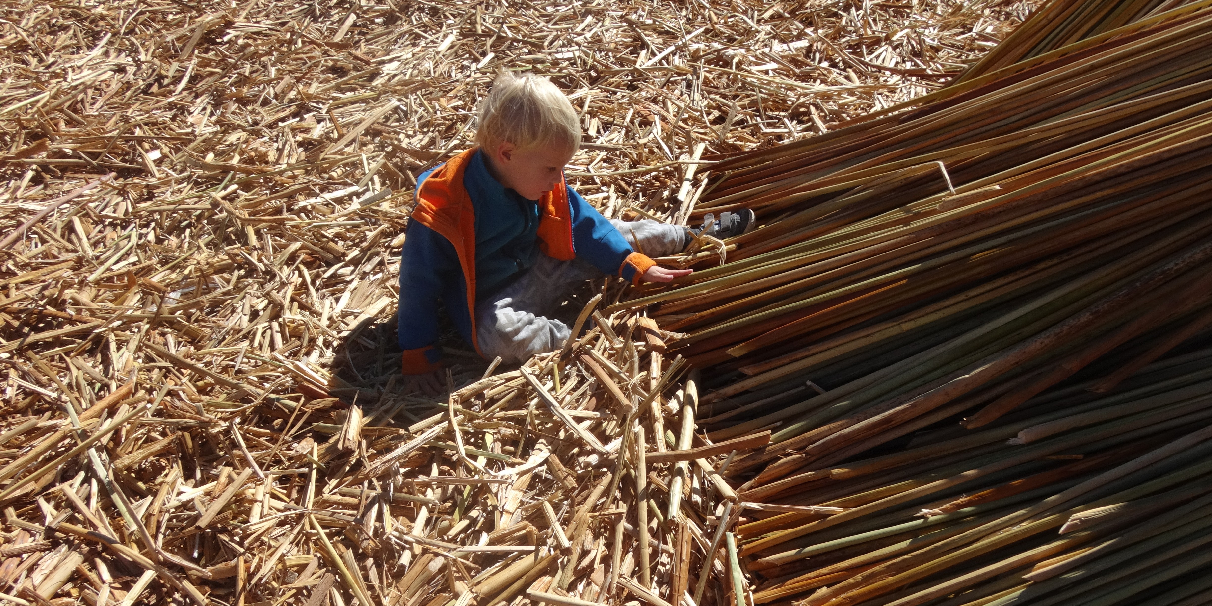 Ces îles sont construites grâce à plusieurs couches de totora (sorte de roseaux). Tous les 2 ou 3 mois il faut rajouter une couche car ça pourri par le fond au fur et à mesure, c’est ce pourrissement et les racines qui se développent autour qui permettent à l’île de flotter, elles sont ancrées par des pieux afin de ne pas trop se balader.