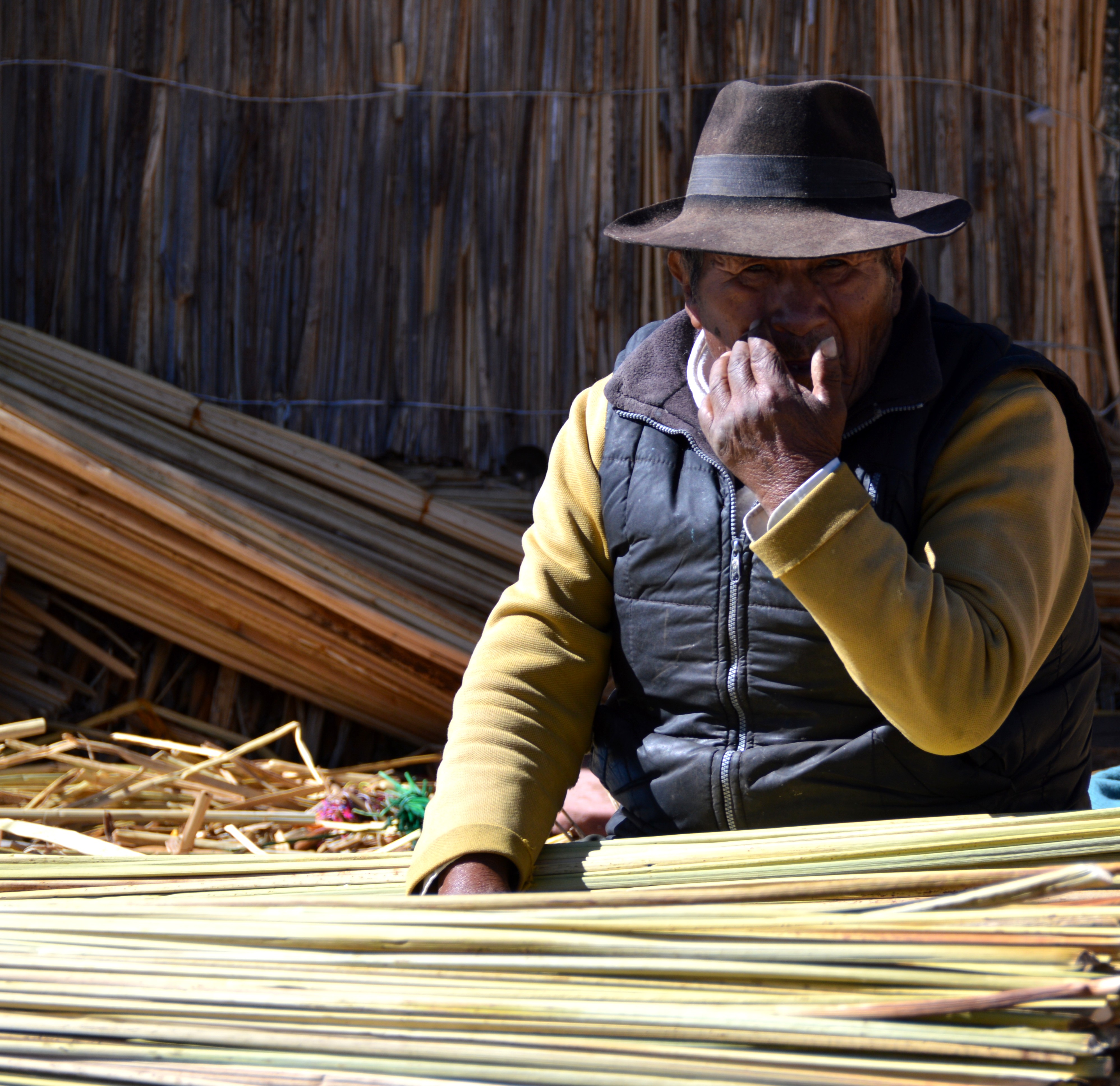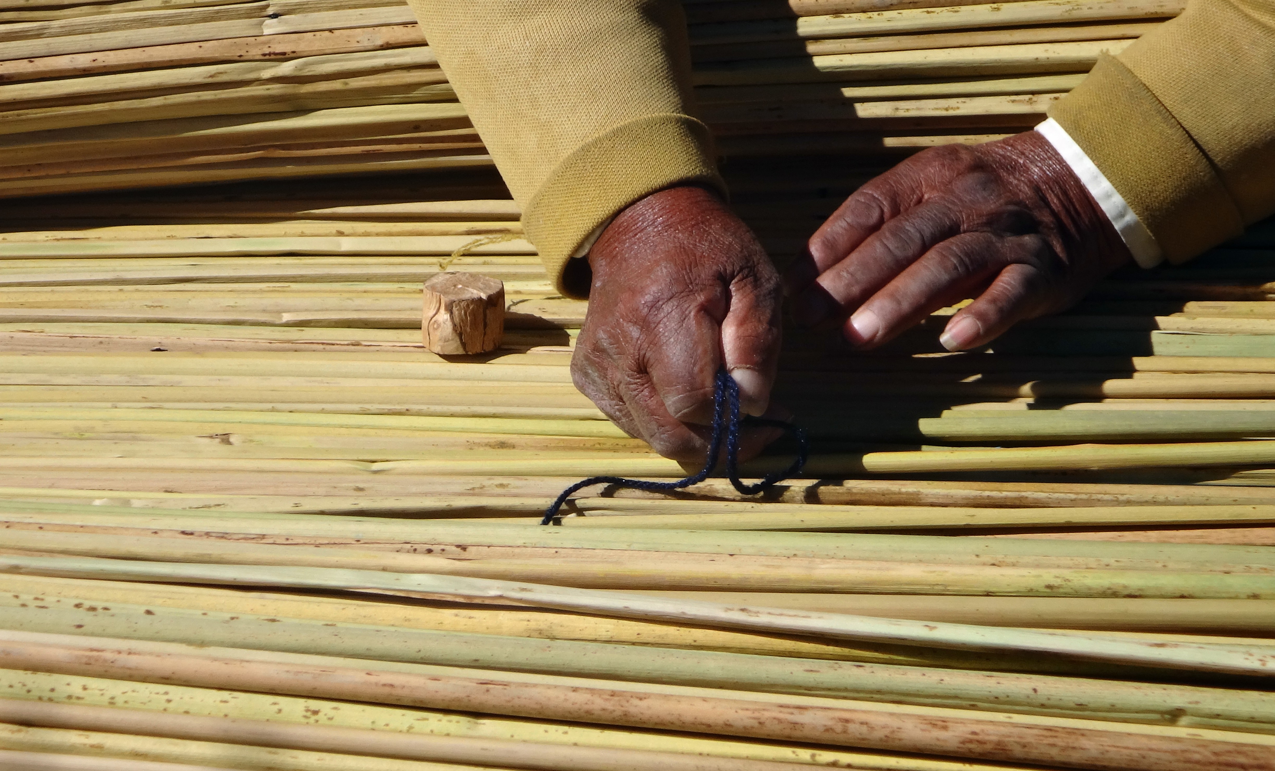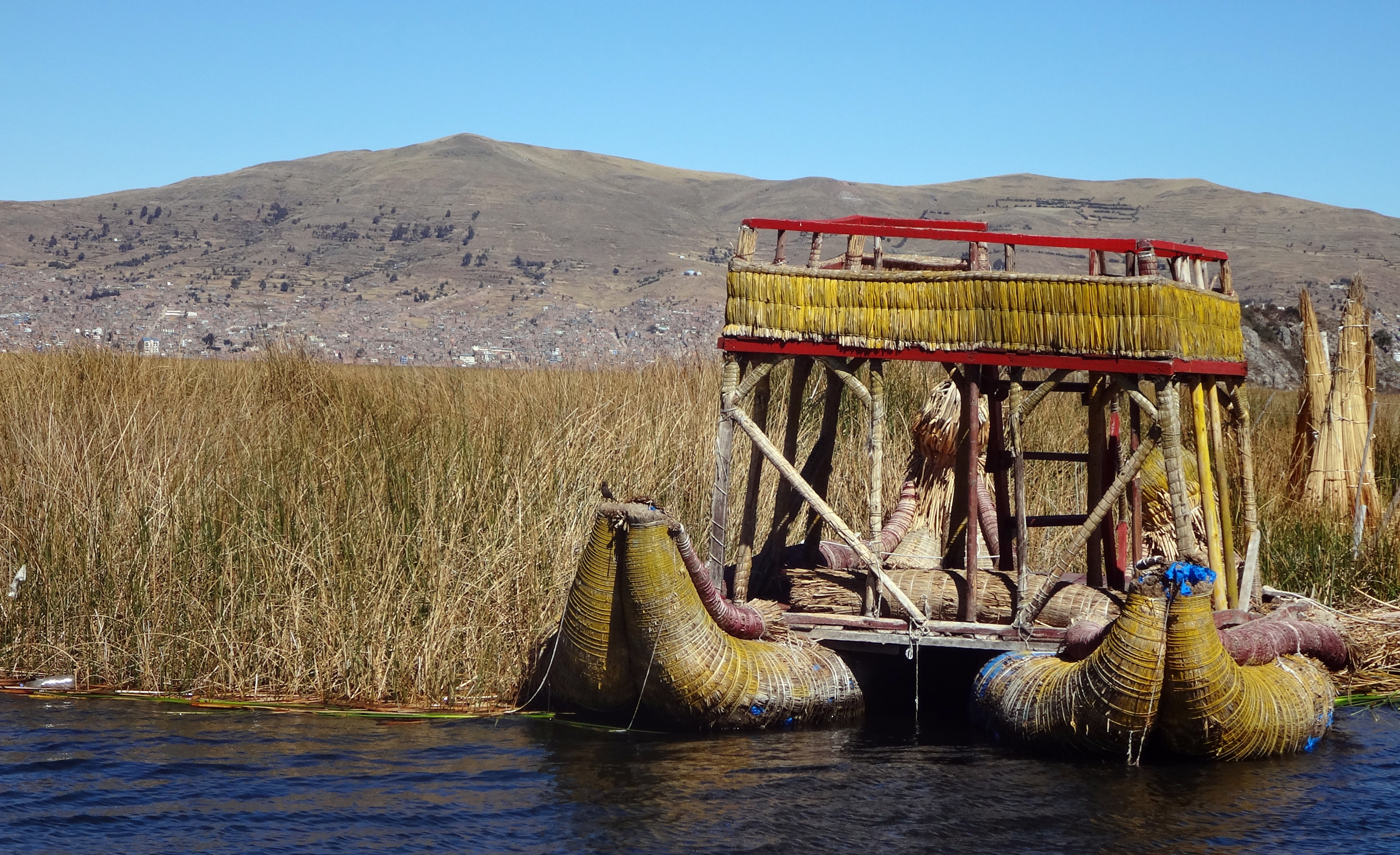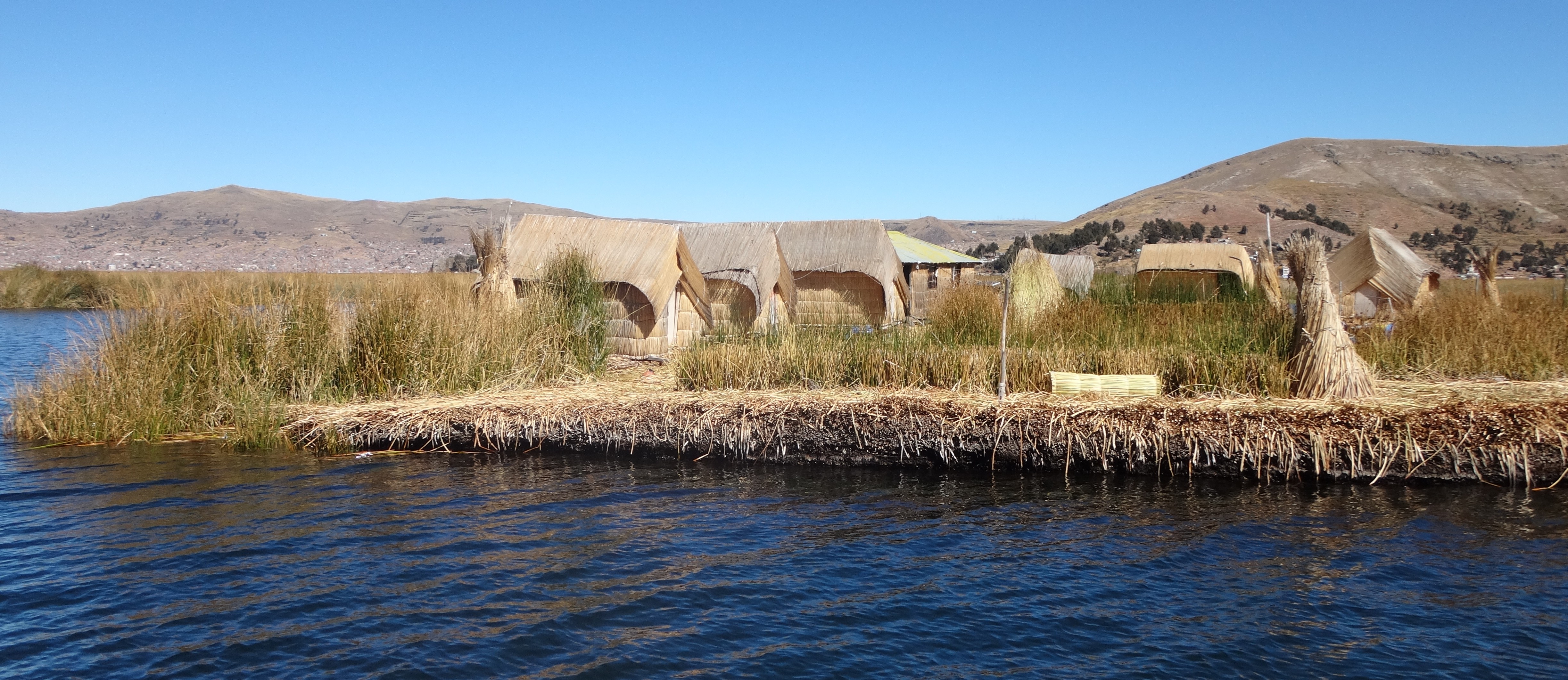 Ces îles sont construites grâce à plusieurs couches de totora (sorte de roseaux). Tous les 2 ou 3 mois il faut rajouter une couche car ça pourri par le fond au fur et à mesure, c’est ce pourrissement et les racines qui se développent autour qui permettent à l’île de flotter, elles sont ancrées par des pieux afin de ne pas trop se balader.
