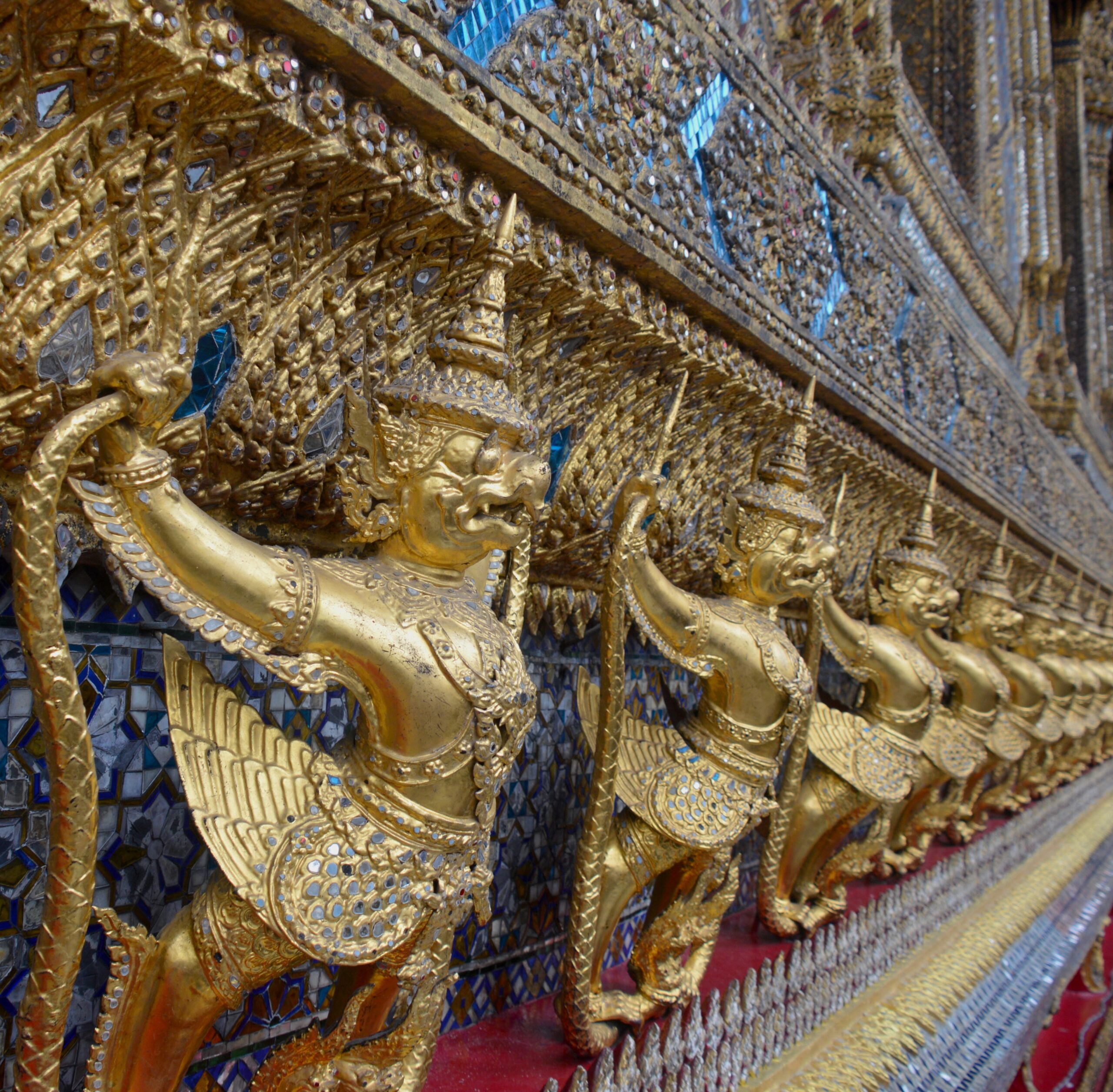Plus traditionnel, nous sommes allés visité le Wat Phra Kaeo ( le temple du Bouddha d’Émeraude) et le Grand Palais. L’ensemble est cerné par une enceinte avec des contrôles de sécurité assez drastiques: passeports obligatoires, épaules et jambes couvertes et fouilles des sacs. Après une longue marche en plein soleil nous arrivons sur les lieux, le tout est scintillant, c’est ce qui vient en premier à l’esprit ! Limite kitsch aussi…ils aiment ce qui brille ici ! Lors de notre visite il y avait beaucoup de monde, surtout des Thaïs vêtus tout en noir. On a fini par comprendre que c’est parce le Grand Palais abrite la dépouille du Roi Bhumibol, mort en octobre 2016. La Thaïlande a alors décrété un deuil national d’un an (!) et les visiteurs vont en grande majorité lui rendre un dernier hommage. A ce propos il faut savoir qu’ici on ne peut pas faire 10 mètres sans voir une photo du Roi, le culte de la personnalité est assez extrême et honnêtement ça a un côté assez dérangeant…