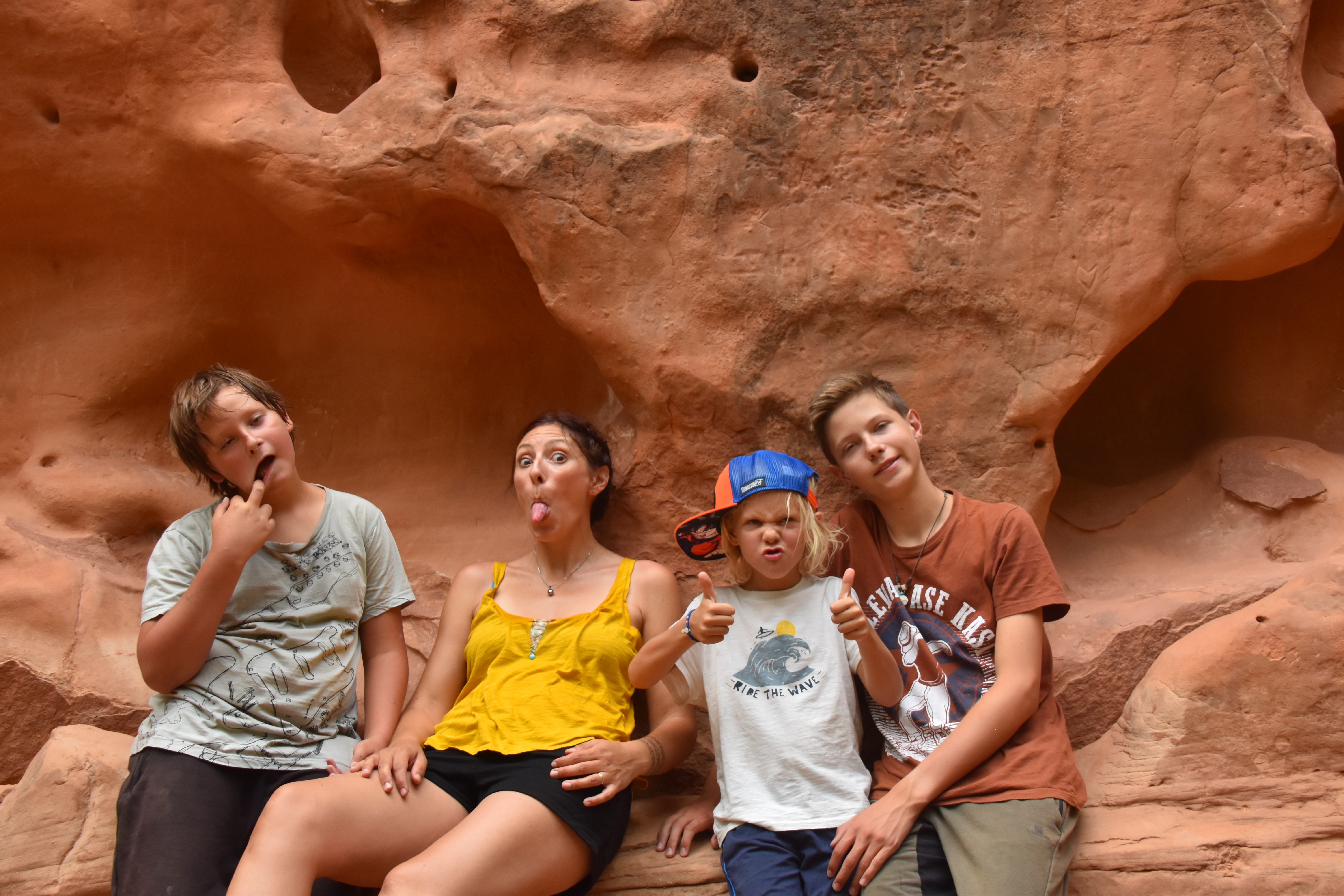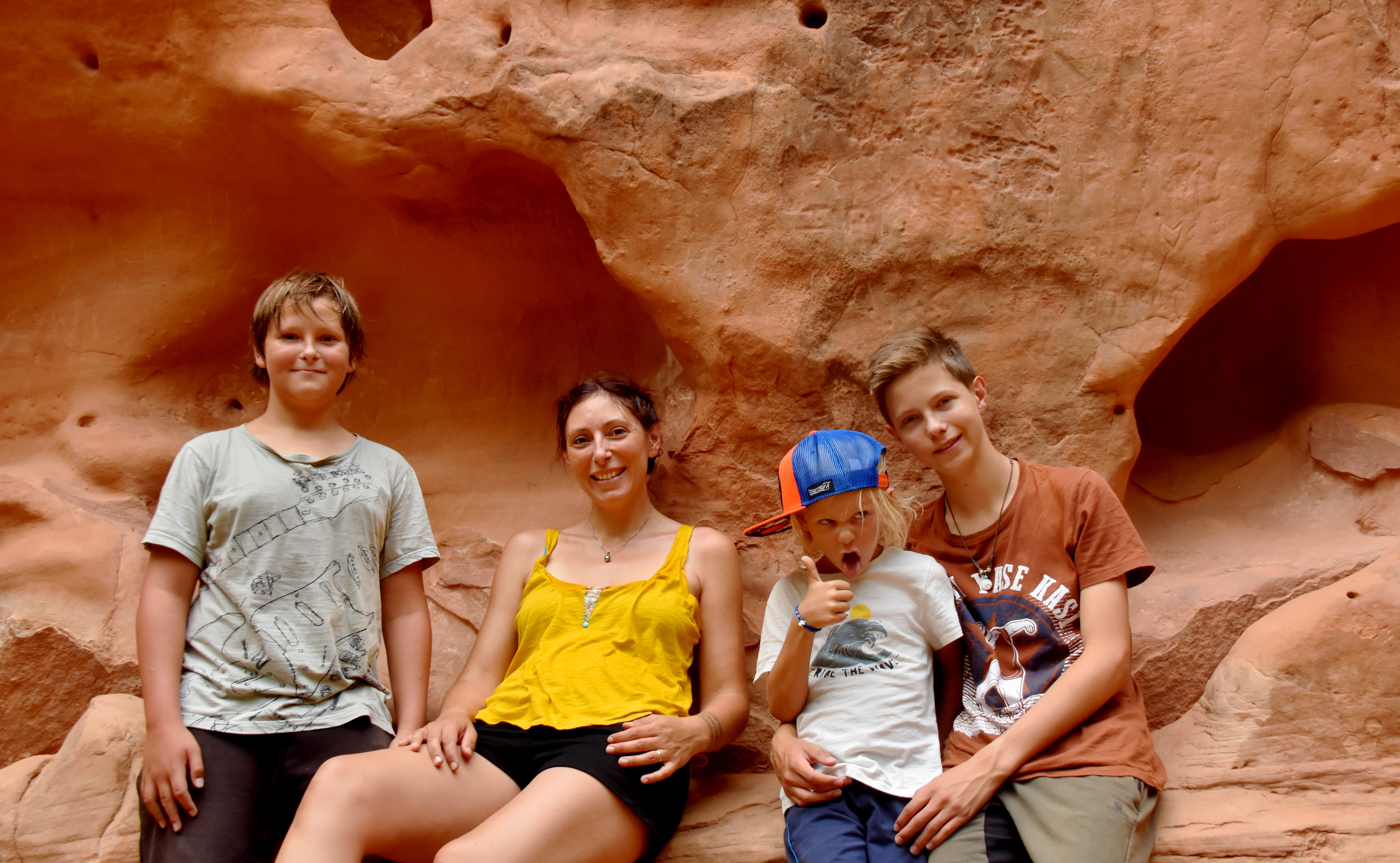 Le parc est vraiment superbe et, malgré la chaleur accablante (on avoisine encore les 40°) nous faisons de super balades dans ce cadre enchanteur. Nous commençons par le bout du parc, faire la Riverside Walk. Comme son nom l’indique nous longeons la rivière et faisons quelques pauses fraîcheur…même si Teva a été le seul à réussir à y entrer en entier, elle est bien plus fraîche ici ! Nous continuons avec les Emerald Pools Trails, des chemins pentus qui débouchent sur des cascades et vasques naturelles.