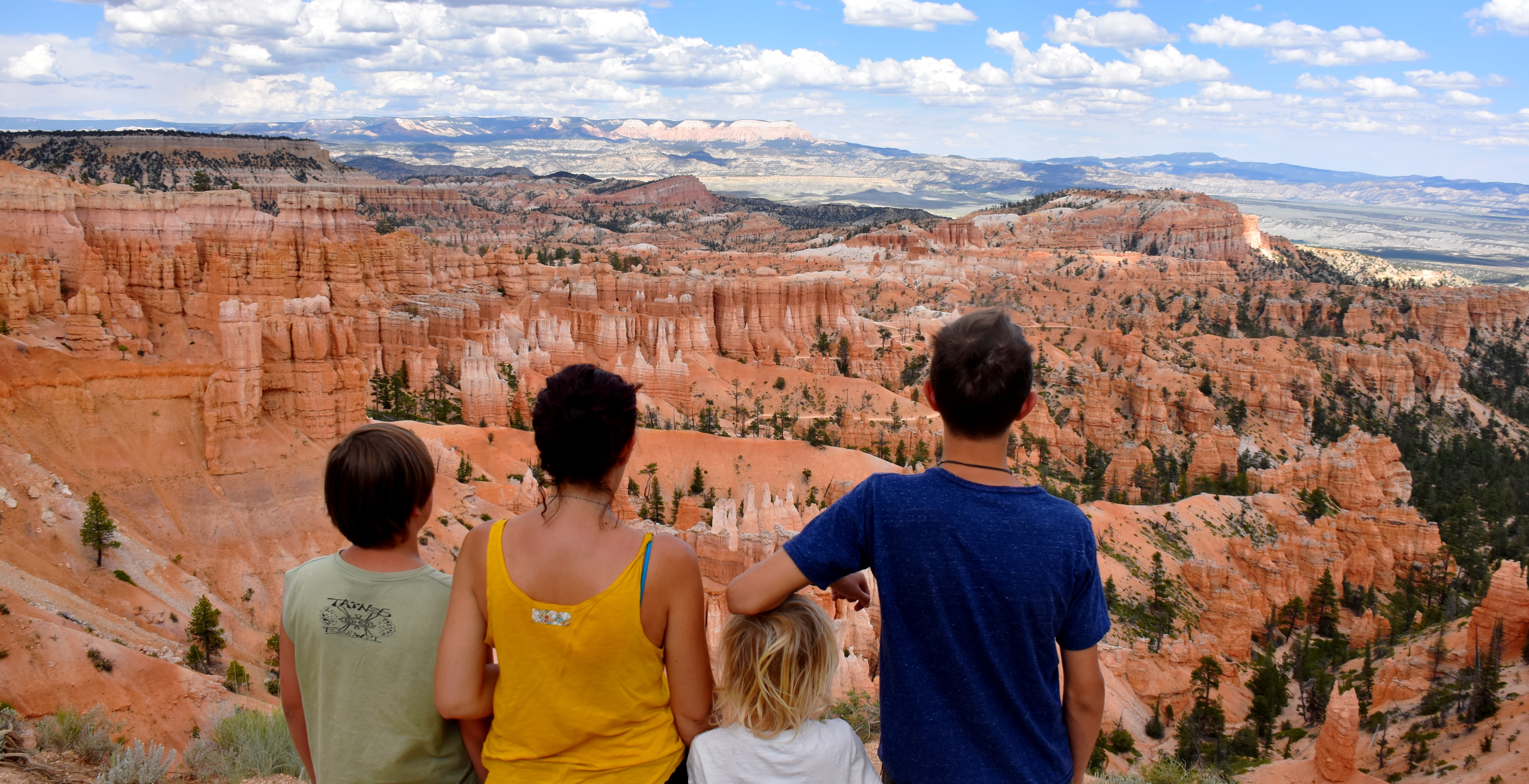 Arrivés à Bryce Canyon la démesure des paysages américains prend tout son sens, nous nous retrouvons face à une sorte de plateau calcaire constitué de cheminées de fées par milliers, allant d’un blanc pur à un rouge profond. La dernière fois que nous étions venus, le canyon était sous la neige, ce qui rendaient les couleurs moins éclatantes. À différentes heures de la journée nous sommes venus nous balader d’un point d’observation à l’autre avec toujours autant d’émerveillement !