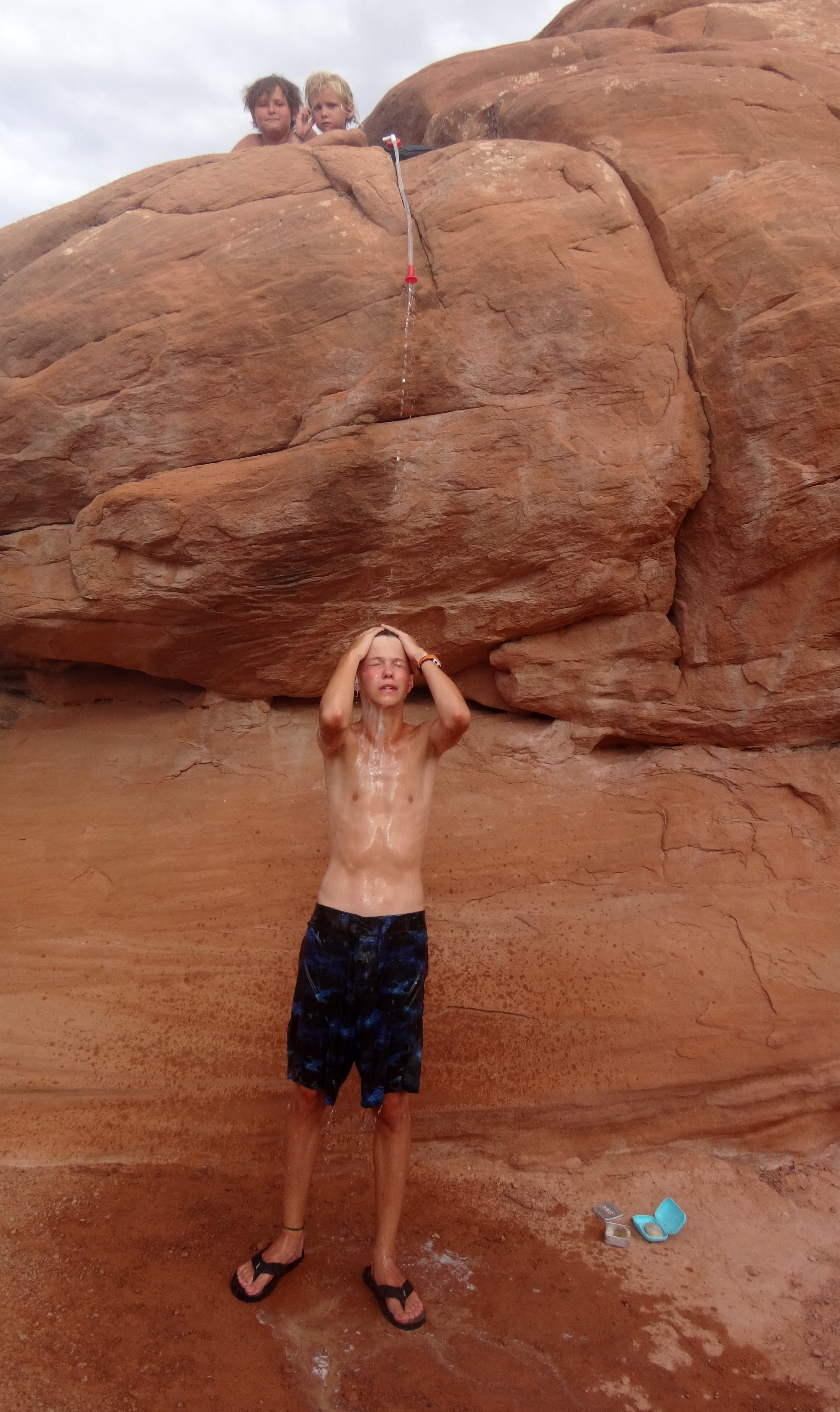 Rassérénés nous rejoignons notre dernier endroit désertique (« tas de pierres » disent les gars) : Arches National Park ! Je ne vais pas faire planer un suspense insoutenable : nous allons donc voir des arches, et on en compte au moins 2000 dans ce petit parc qui se visite facilement en une journée. Nous avons fait toutes les balades de moins de 3 km, il fait bien trop chaud pour aller au delà (et l’envie de balancer nos enfants du haut d’une falaise est encore présente, autant faire attention et ne pas prendre le risque). Le seul camping du parc est vraiment sympa, entre gros rochers ronds et végétation !