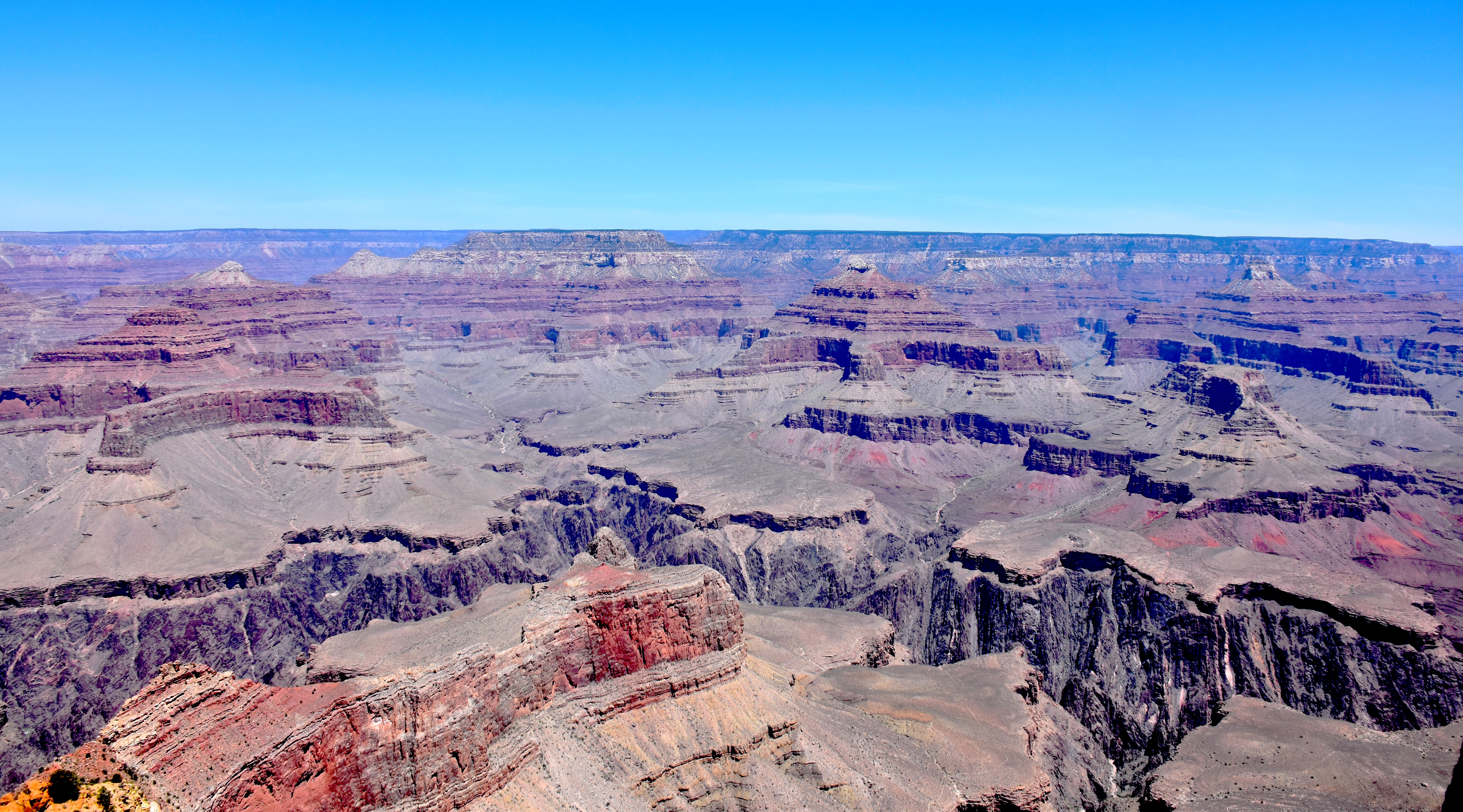 Encore une fois le parc nous offre des points de vue assez incroyables et tout est super bien organisé. Malgré le nombre de visiteurs, le système de navettes gratuites nous permet d’arpenter la rive sud facilement et de faire quelques balades où nous sommes vraiment seuls face à ce spectacle magique que nous offre la nature. Ici les chiffres donnent le tournis : le Grand Canyon s’étend sur 450 km de long, sa profondeur moyenne est de 1300m et il peut atteindre 30 km de large ! Tout en bas s’écoule le Colorado, que l’on peut apercevoir de quelques points de vue…Autant dire qu’on se sent tout petits…