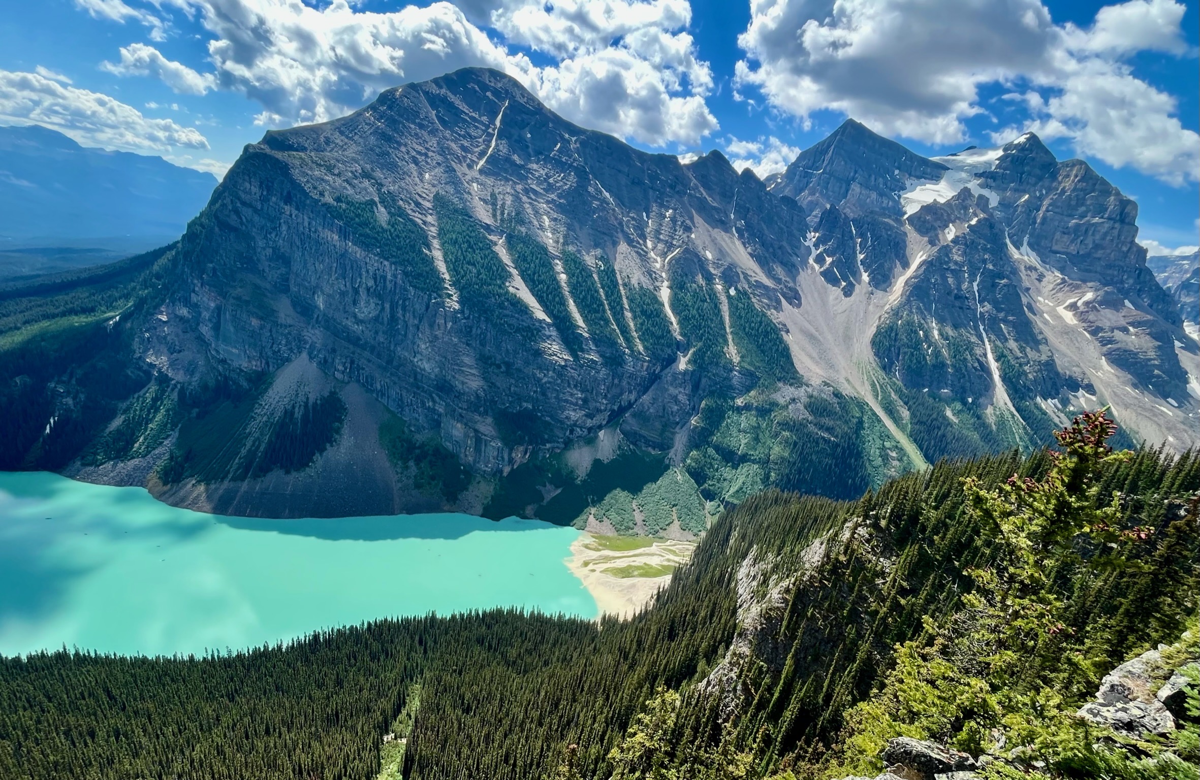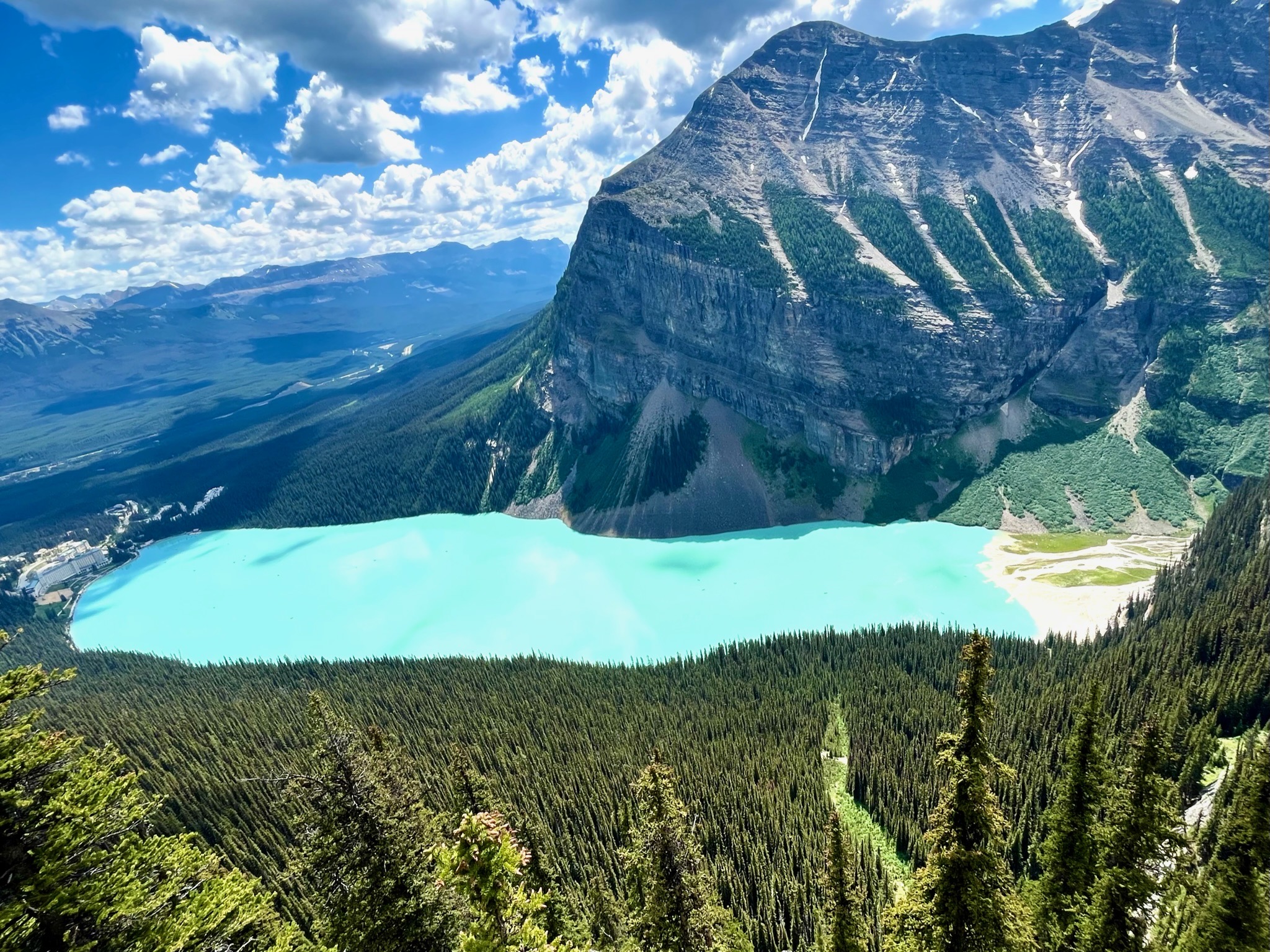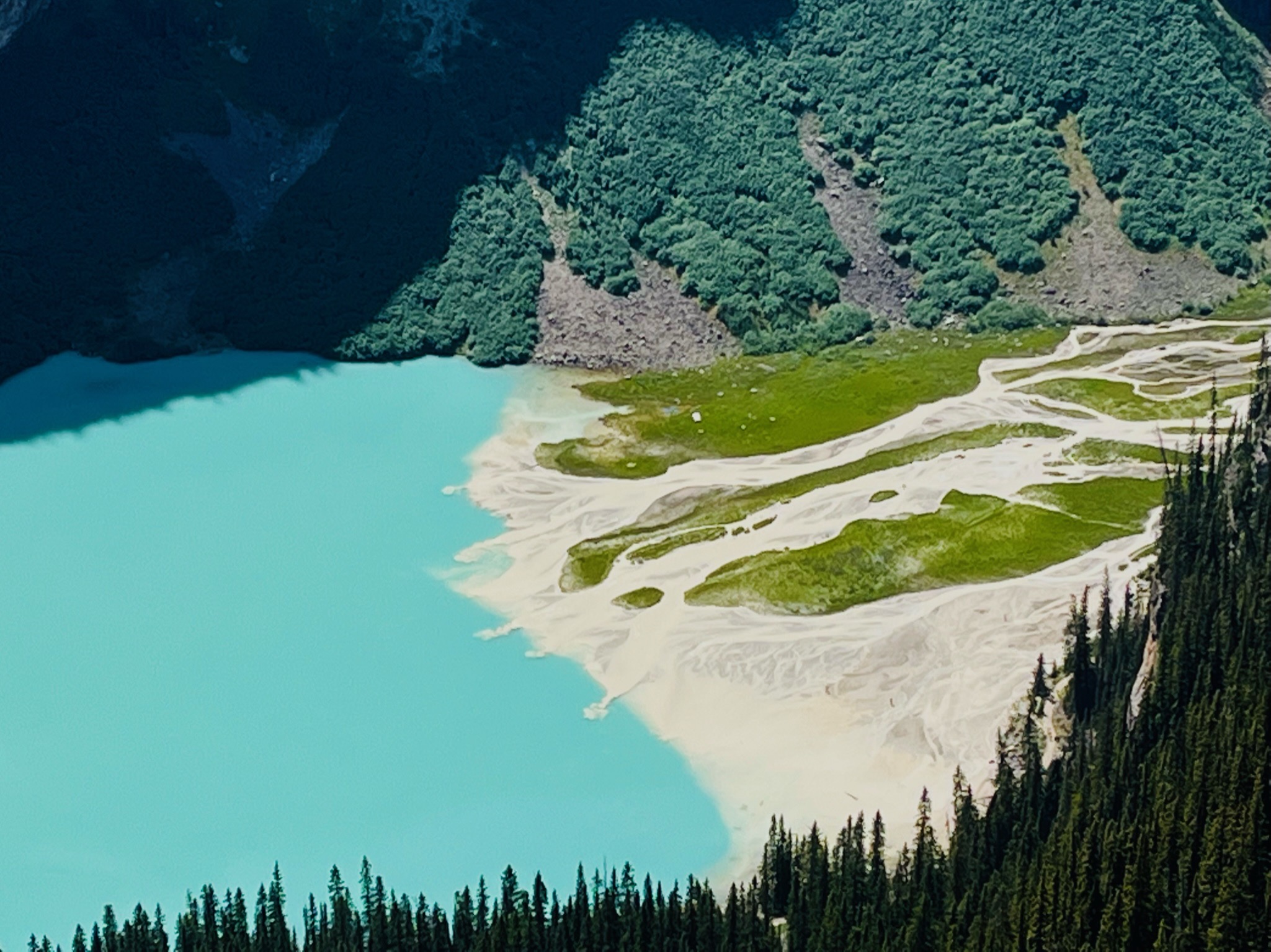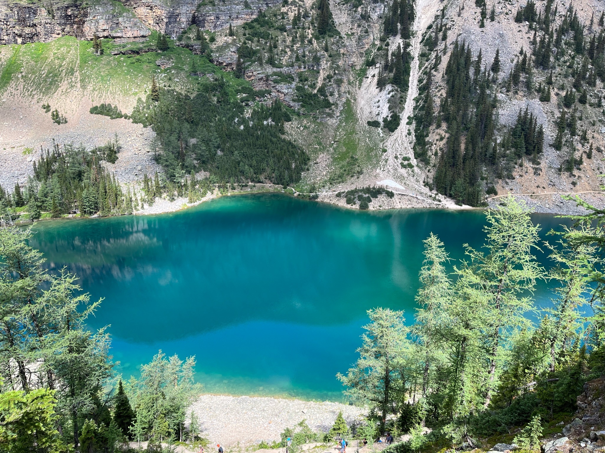 Le lendemain, le lac Louise nous en met plein la vue. Pour avoir le maximum de points de vue différents, nous faisons l’ascension du Big Beehive : 15 km aller-retour, un dénivelé de fou, mais des paysages dingues ! C’est la seule rando qui permet de voir les plages du lac… assez surréaliste ! Elle fait aussi passer par d’autres lacs plus petits, comme le Lake Agnes, et par des étendues de neige.