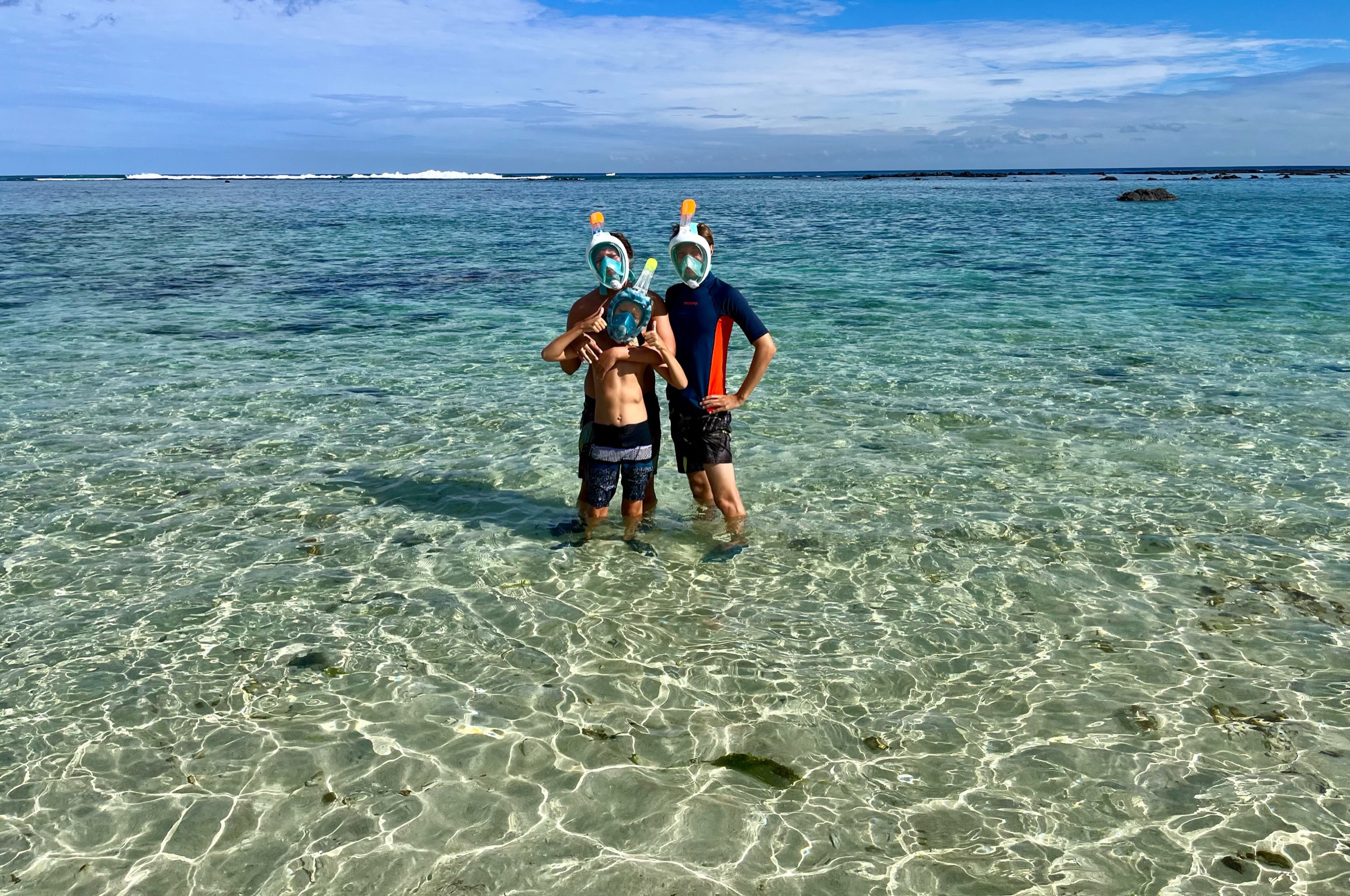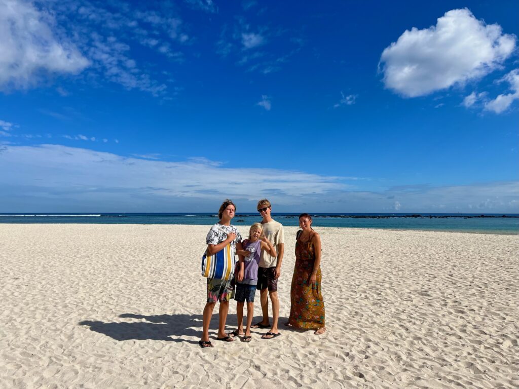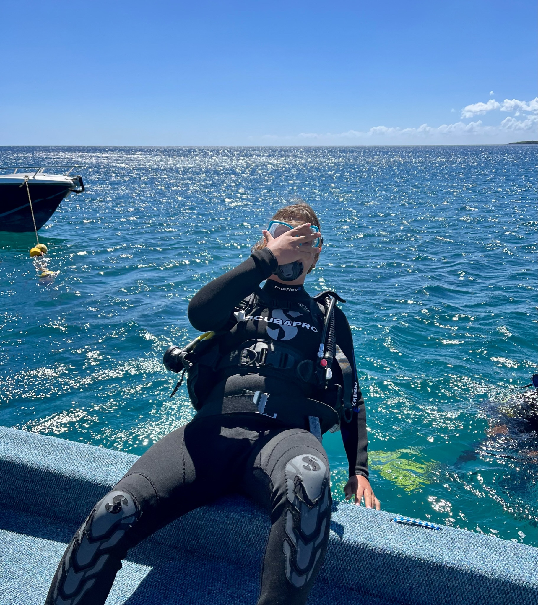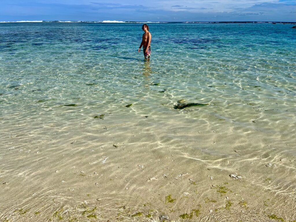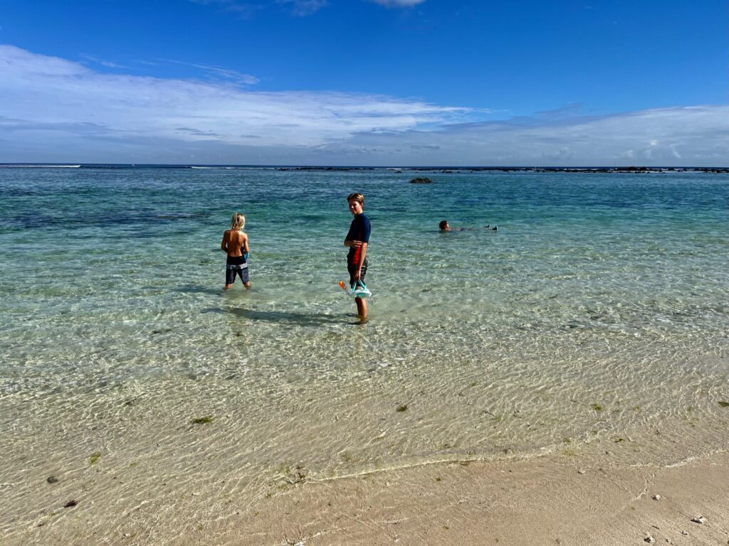 Le premier jour, nous voilà donc partis pour découvrir les fonds marins mauriciens. Teva, Maleï et moi en baptême, Tao pour le début de ses cours théoriques et pratiques. Manque de chance, à peine arrivé à un mètre sous l’eau, Tao a très mal à une oreille. Il remonte, redescend… rien à faire, ça ne passe pas. Contrecoup de l’avion ? Tympan fragilisé par les semaines de baignade et de vent en Corse ? On ne saura pas, mais il doit abandonner. Même les jours suivants, ça ne s’arrange pas… il est obligé d’abandonner, déçu…