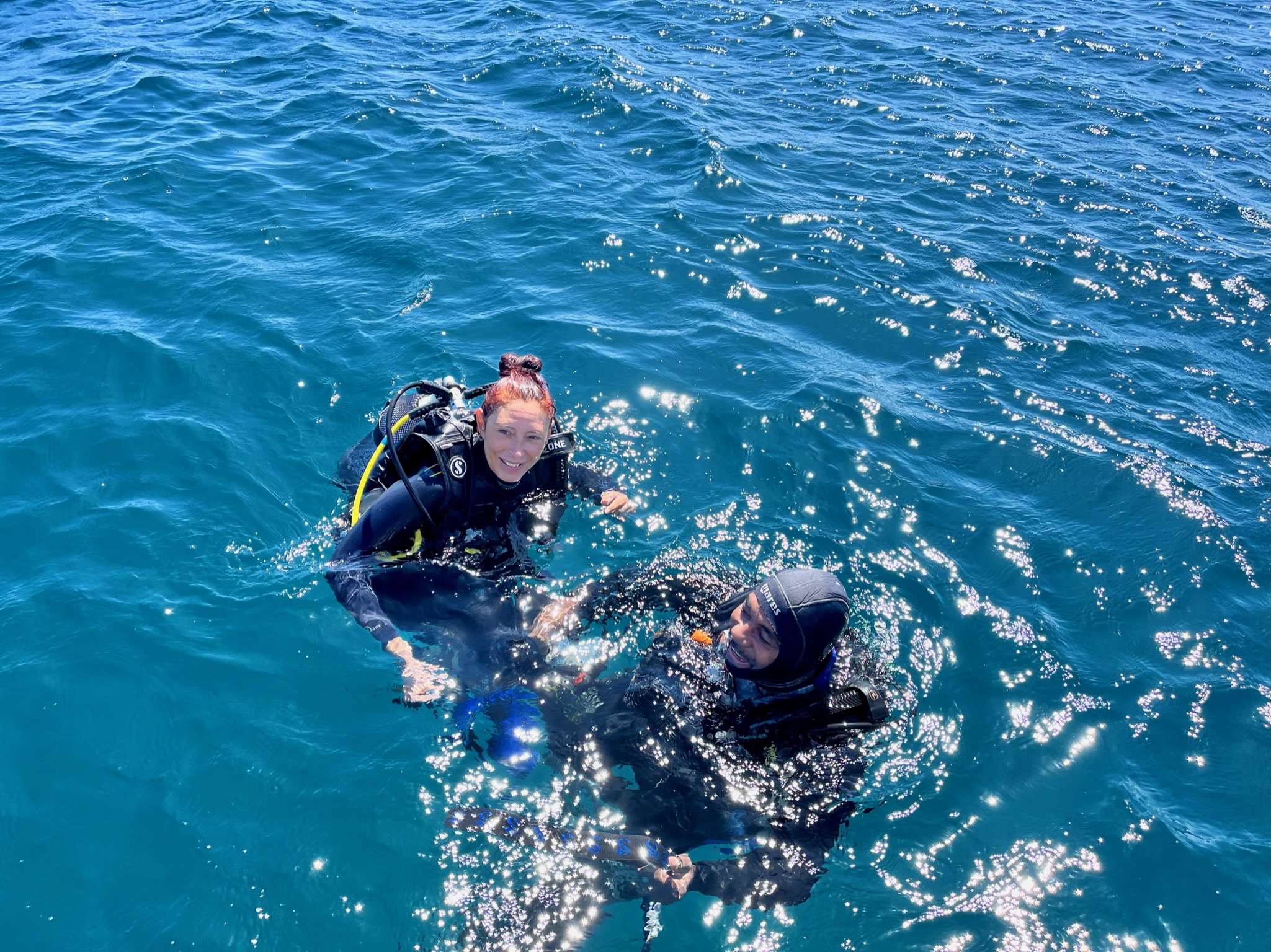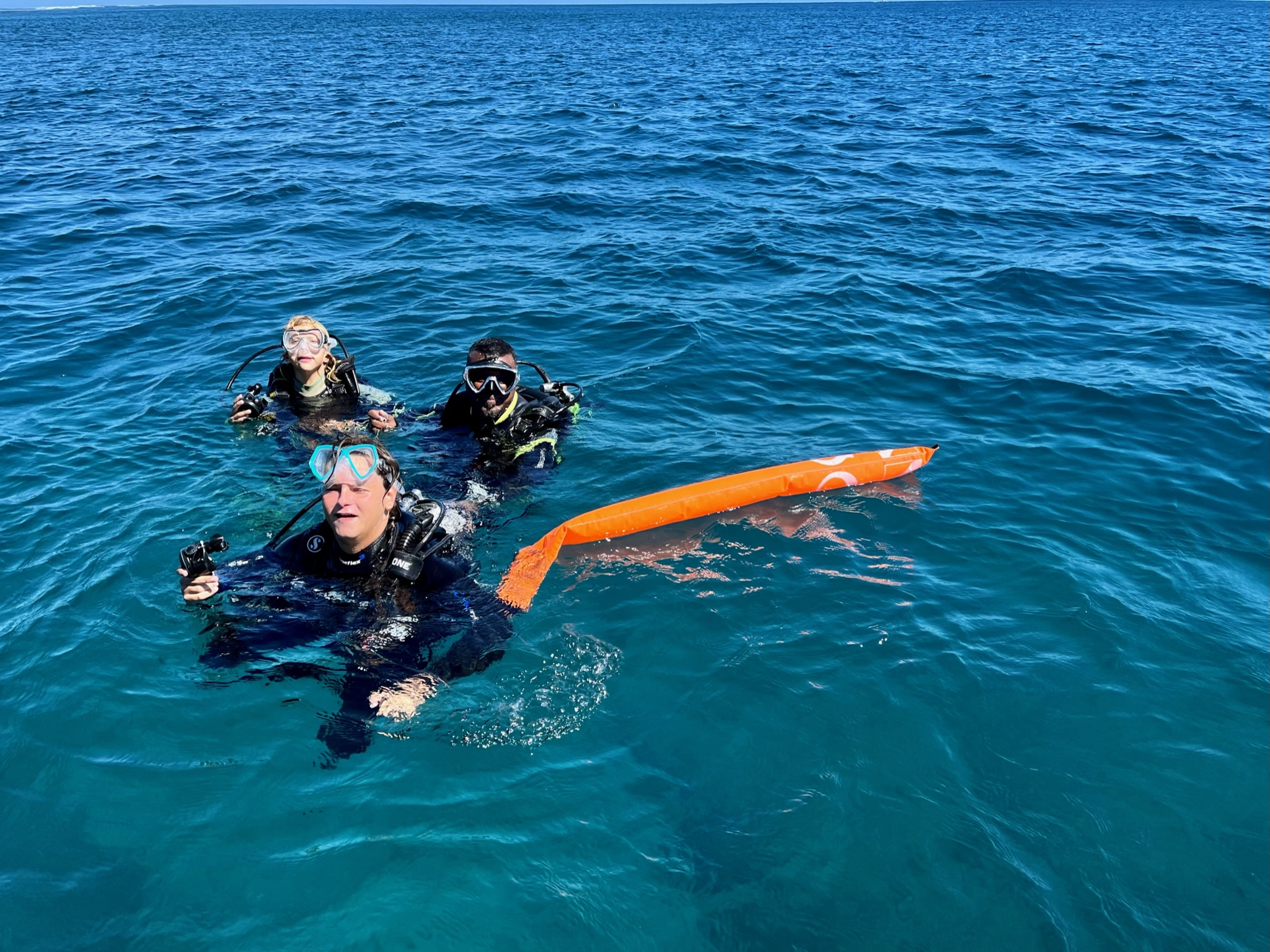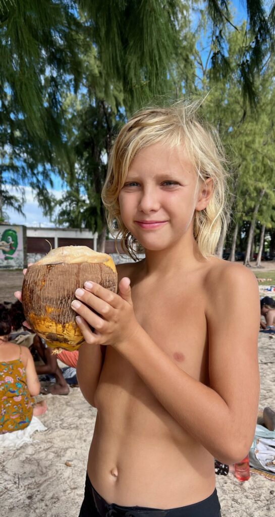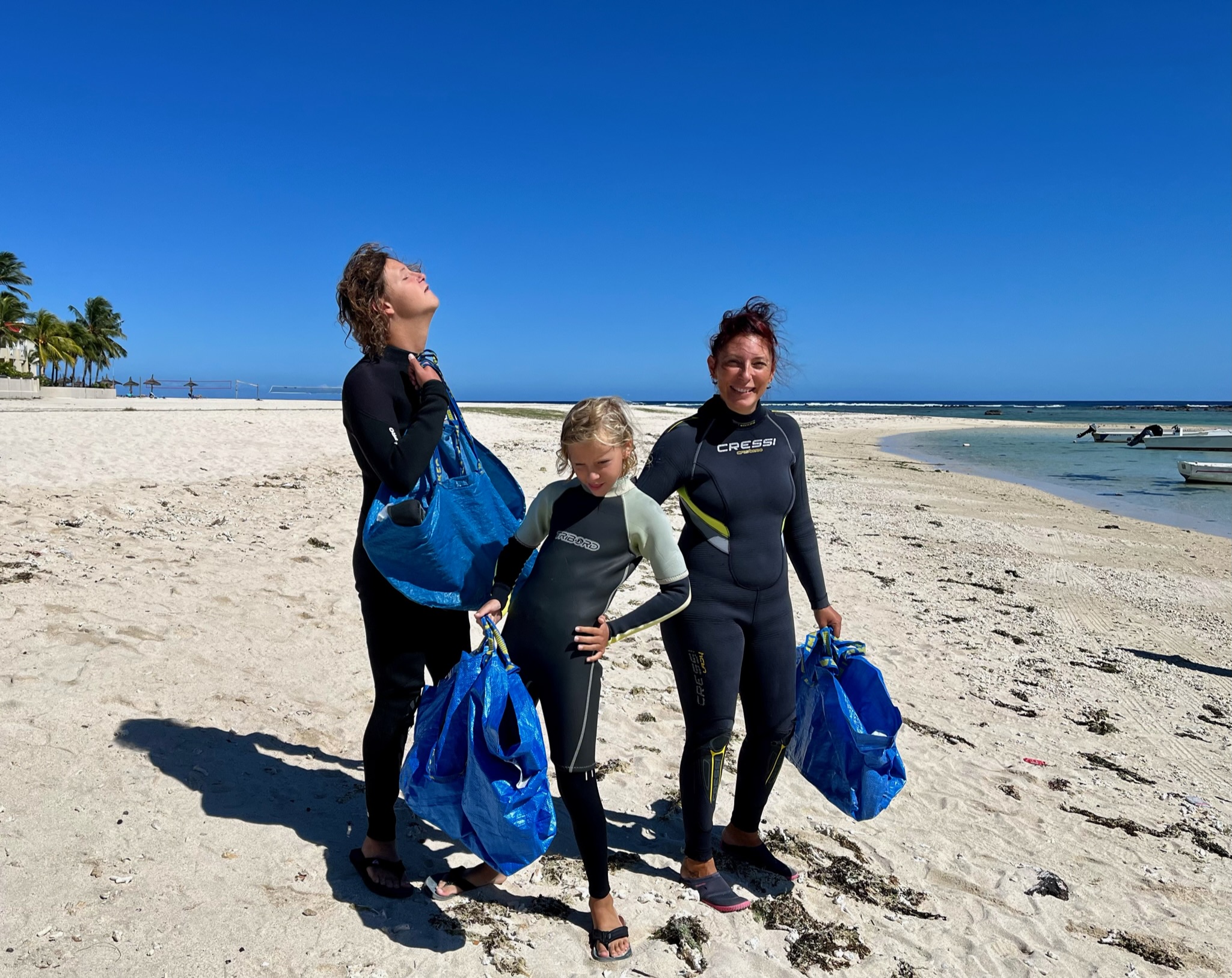 Le premier jour, nous voilà donc partis pour découvrir les fonds marins mauriciens. Teva, Maleï et moi en baptême, Tao pour le début de ses cours théoriques et pratiques. Manque de chance, à peine arrivé à un mètre sous l’eau, Tao a très mal à une oreille. Il remonte, redescend… rien à faire, ça ne passe pas. Contrecoup de l’avion ? Tympan fragilisé par les semaines de baignade et de vent en Corse ? On ne saura pas, mais il doit abandonner. Même les jours suivants, ça ne s’arrange pas… il est obligé d’abandonner, déçu…