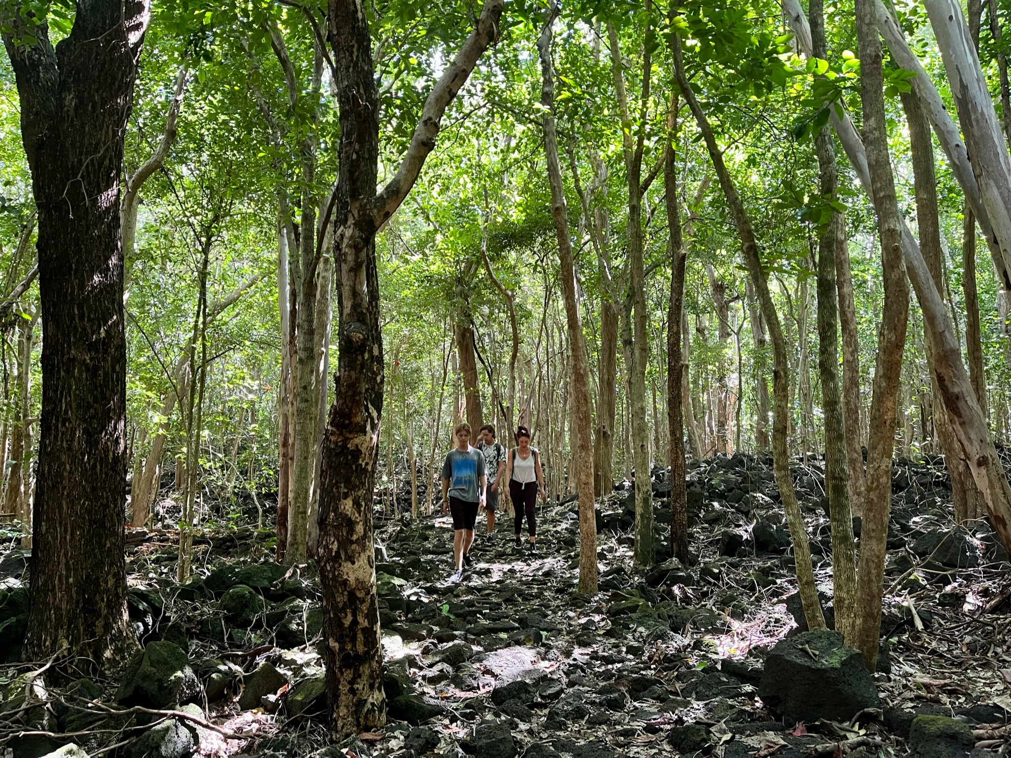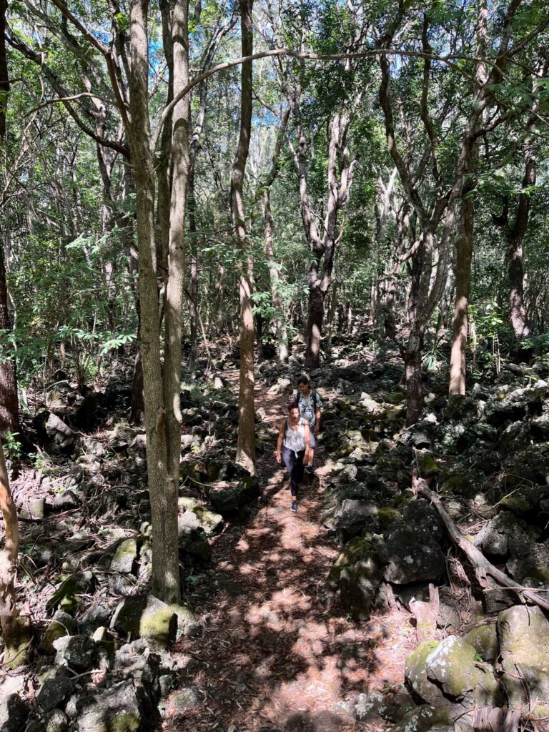 Dernière semaine sur cette magnifique île Maurice. Nous nous arrêtons d’abord au parc national de Bras d’Eau, dans l’est, pour faire une petite rando de 6 km. Quasiment tout le sentier se fait sur de la pierre de lave, très jolie, mais un peu casse-figure ! Encore une fois nous sommes quasiment seuls et la végétation est bien différente par rapport aux autres balades que l’on a pu faire.